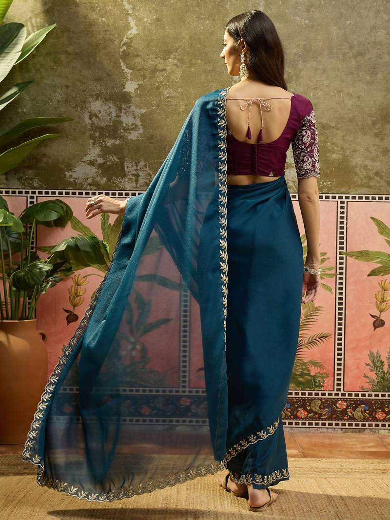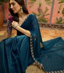 Teal neon chiffon embroidered saree with unstitched blouse piece
