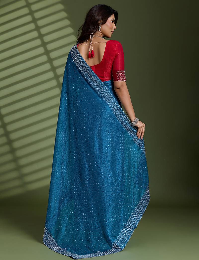 Teal silk chiffon embellished saree with unstitched blouse piece