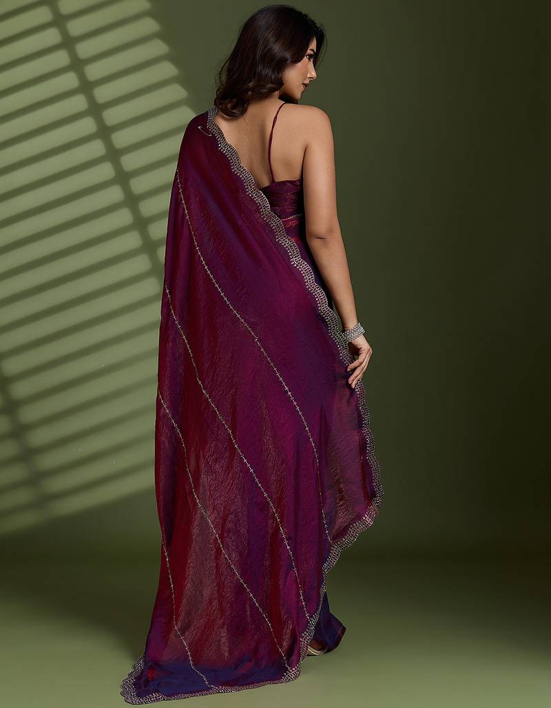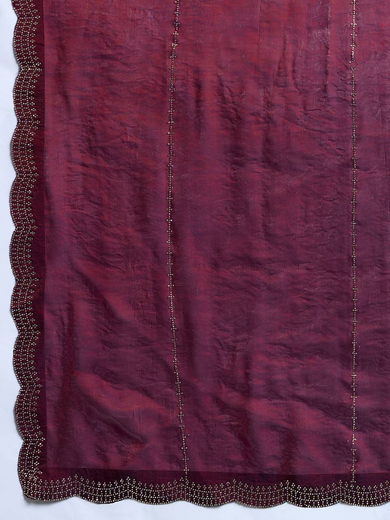 Wine silk satin embellished saree with unstitched blouse piece