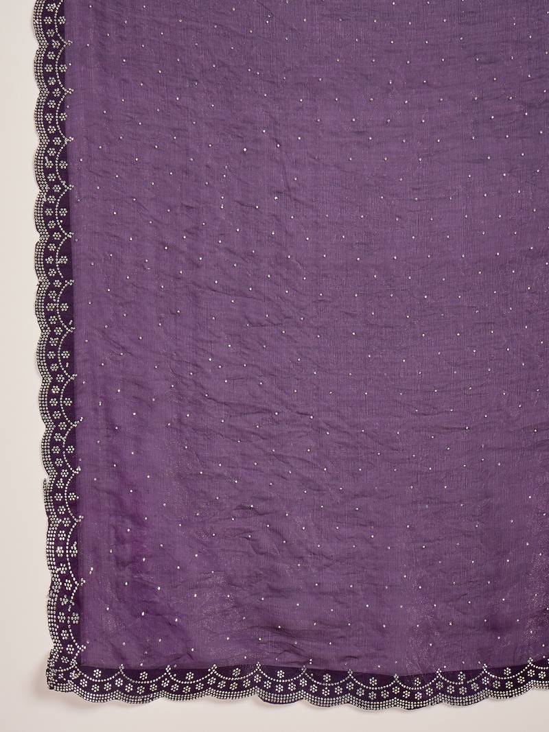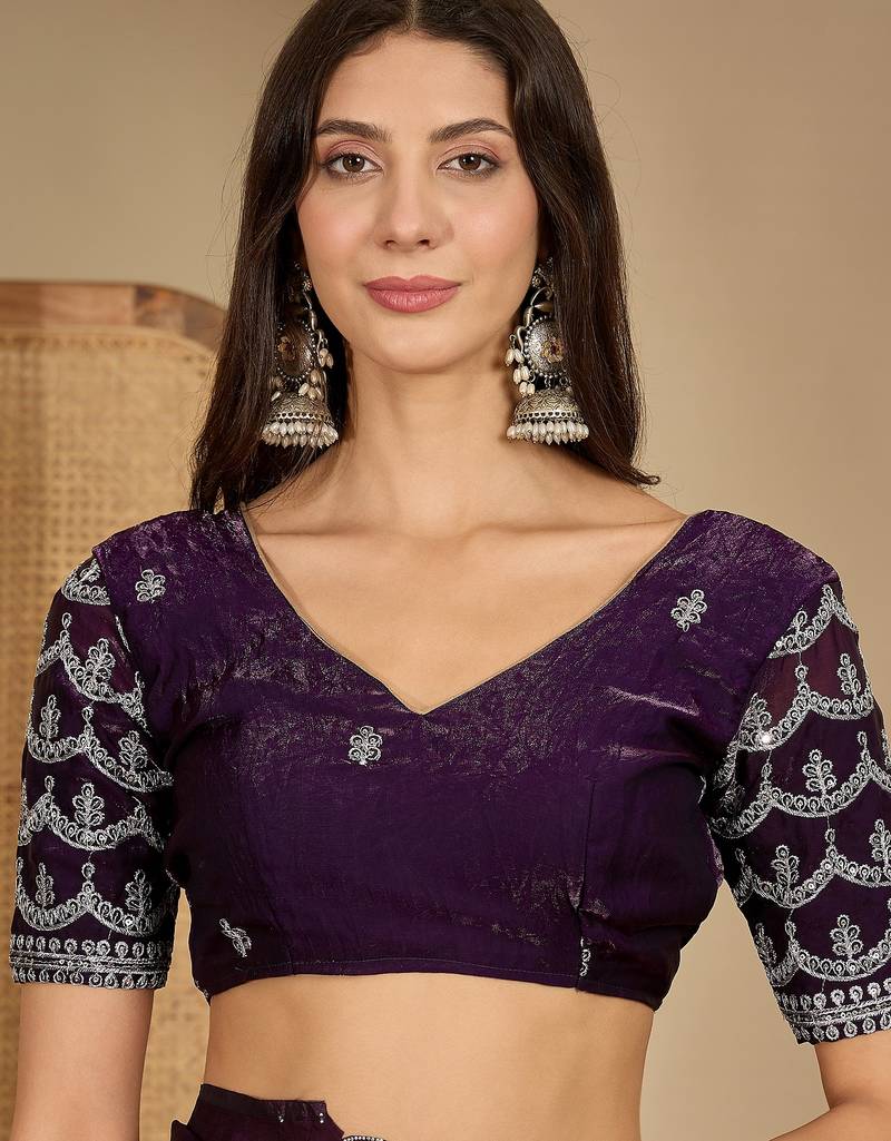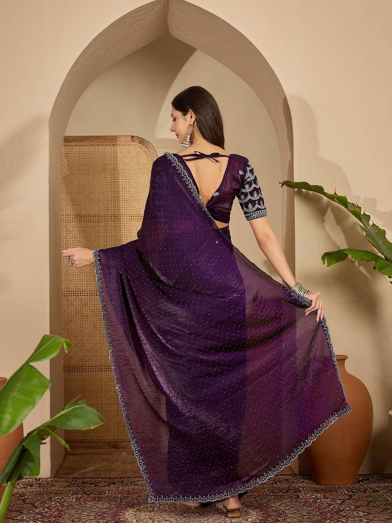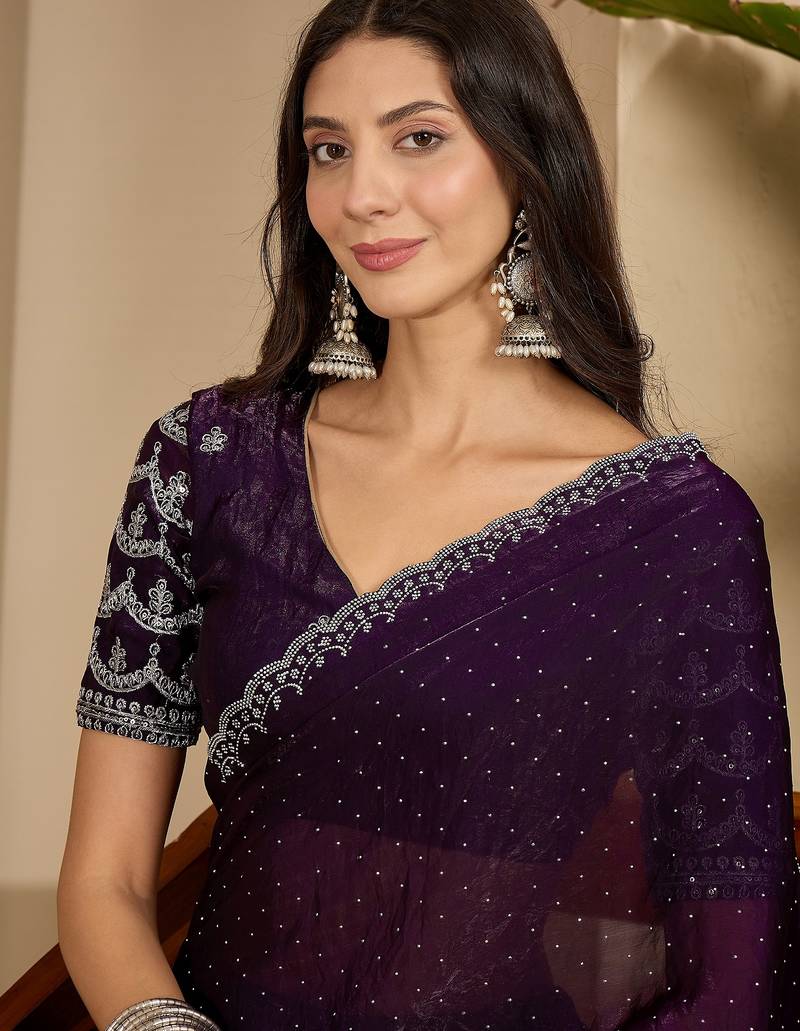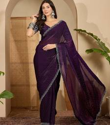 Women's purple silk blend chiffon embellished saree with unstitched blouse piece