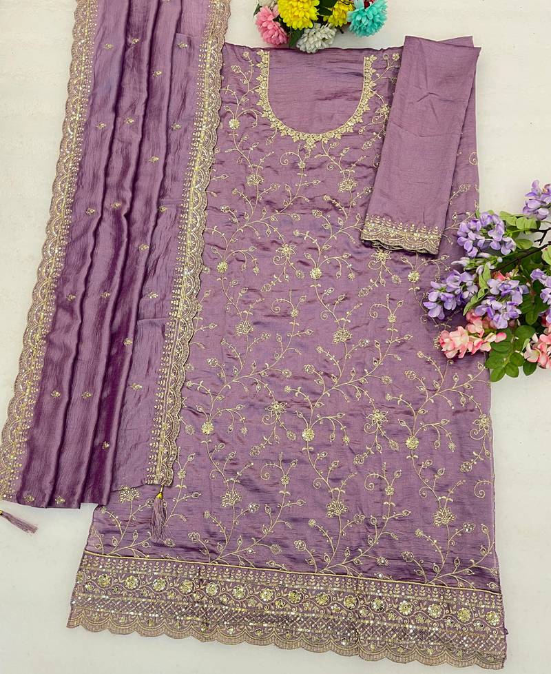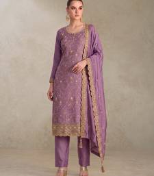 Lilac silk straight suit for women heavy embroidery work semi stitched