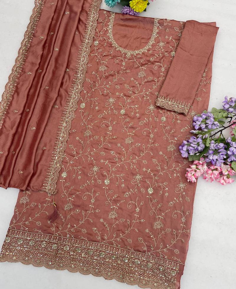 Peach silk straight suit for women heavy embroidery work semi stitched