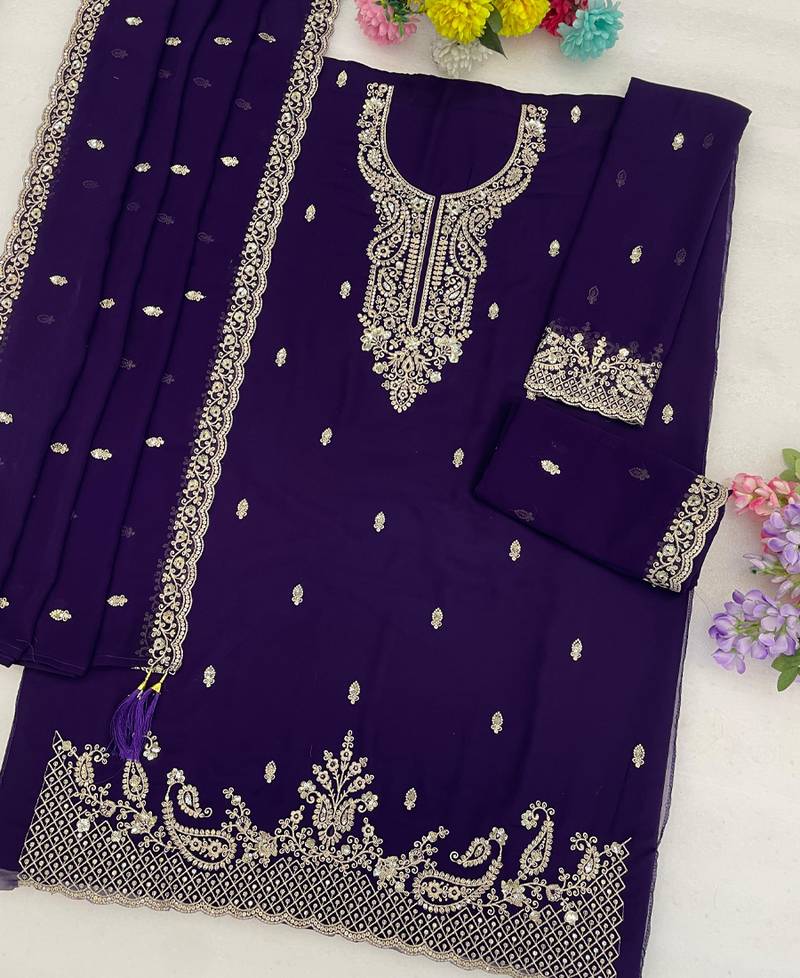 Purple georgette fancy suit for women heavy embroidery semi stitched