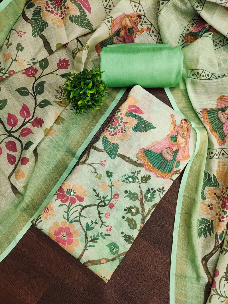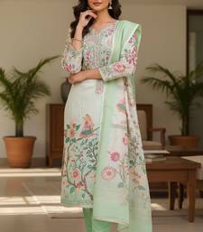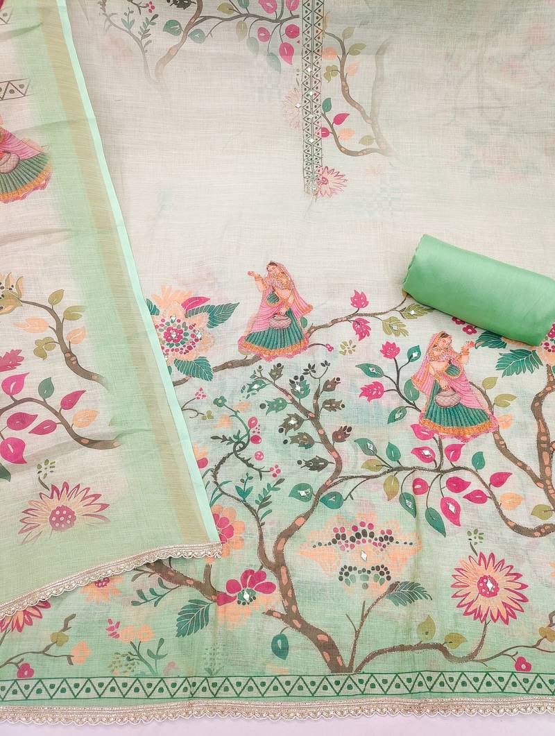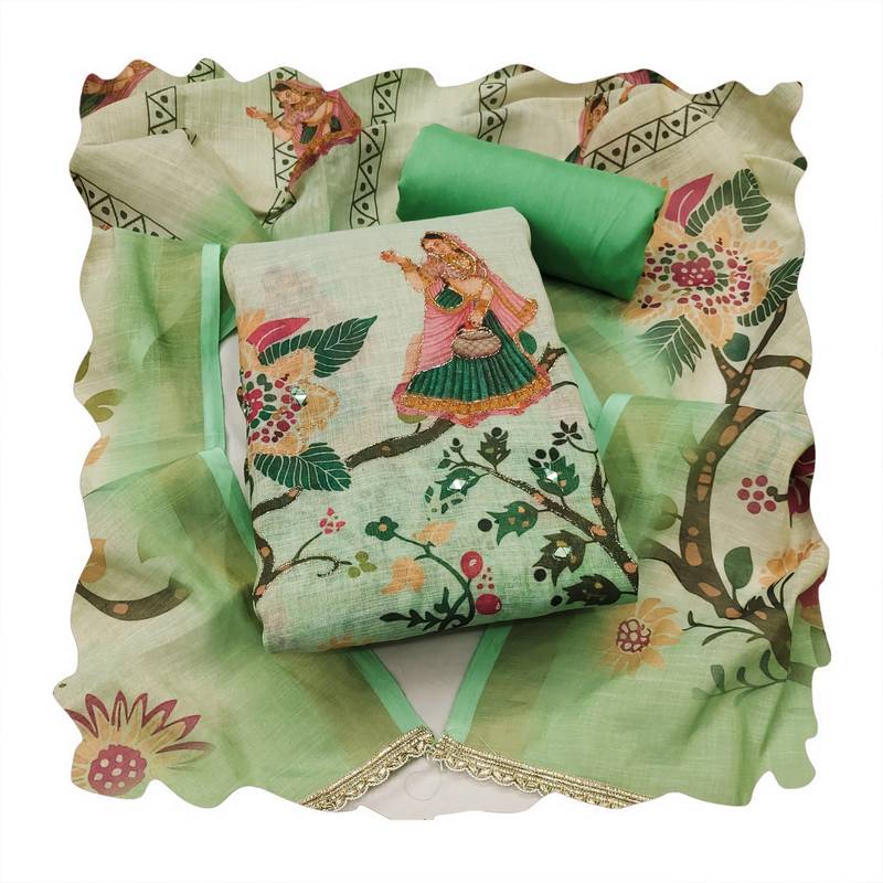 Beautiful sea green color linen cotton fabric designer salwar kameez for girls unstitched