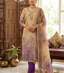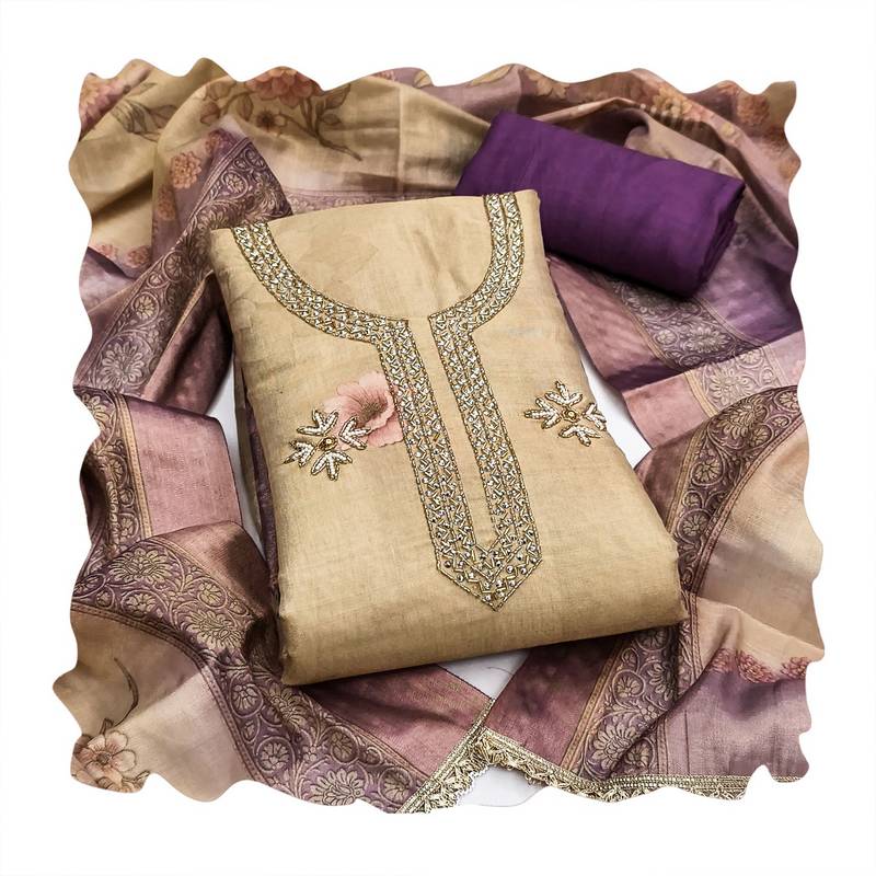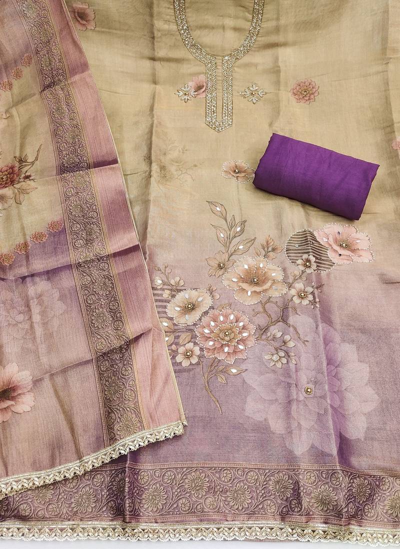 Beige color beautiful printed with hand work simmer cotton fabric salwar kameez unstitched