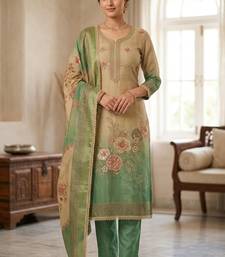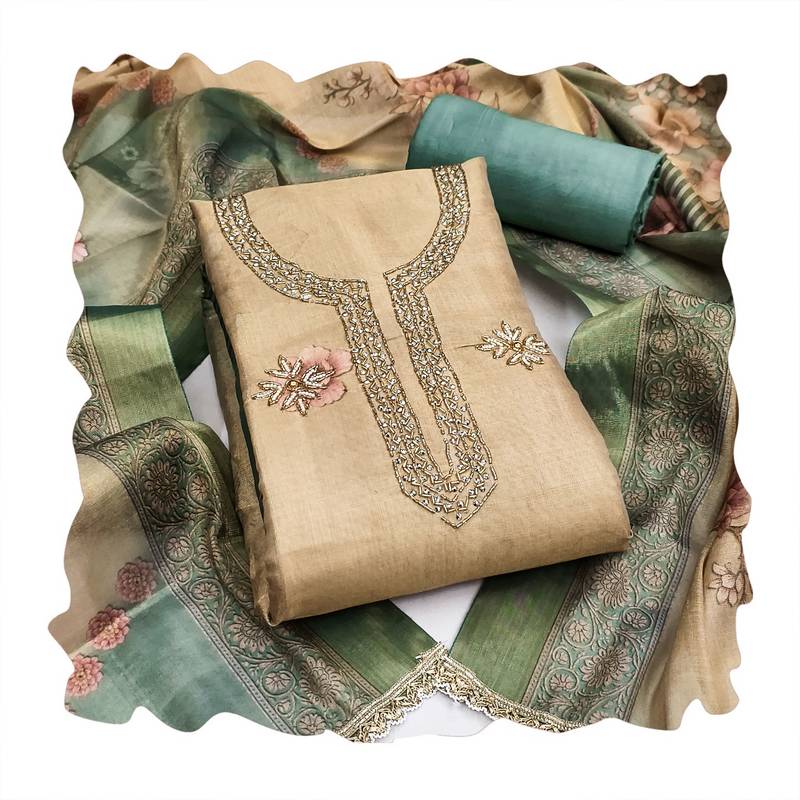 Beige color beautiful printed with hand work simmer cotton fabric salwar kameez unstitched