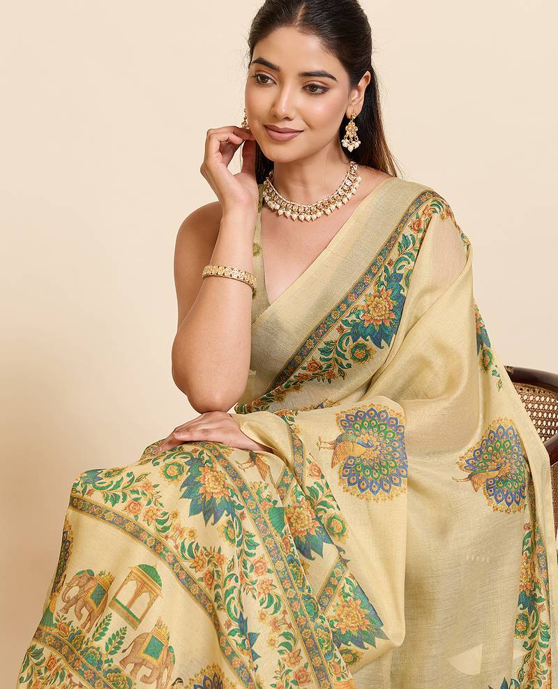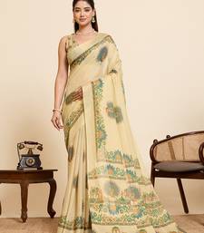 Beige color linen fabric beautful ethnic partywear saree