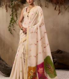Beige color muga cotton fabric resham woven designer ethnic saree
