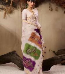 Beige color muga cotton fabric resham woven designer ethnic saree
