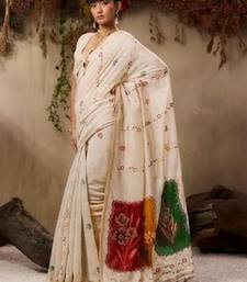 Beige color muga cotton fabric resham woven designer ethnic saree