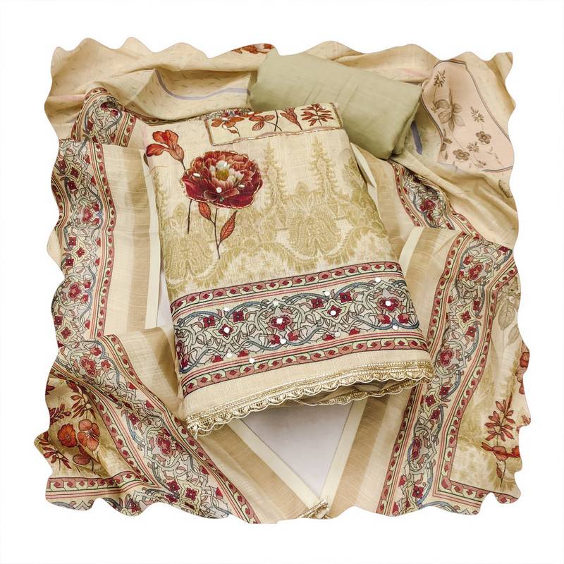 | • | Dupatta | : | Color- Beige / Fabric- Blended Cotton |
