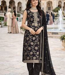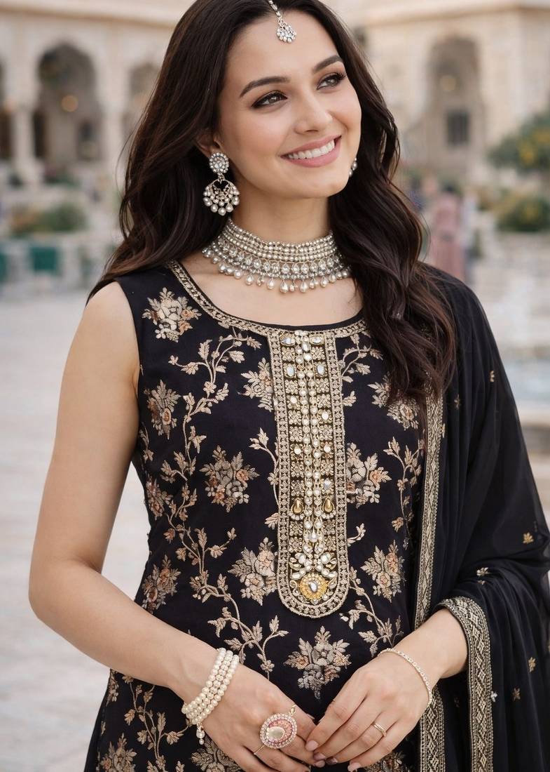 Black color beautiful and ethnic viscose jacquard fabric designer embroidered suit