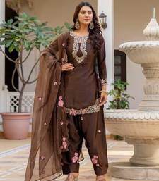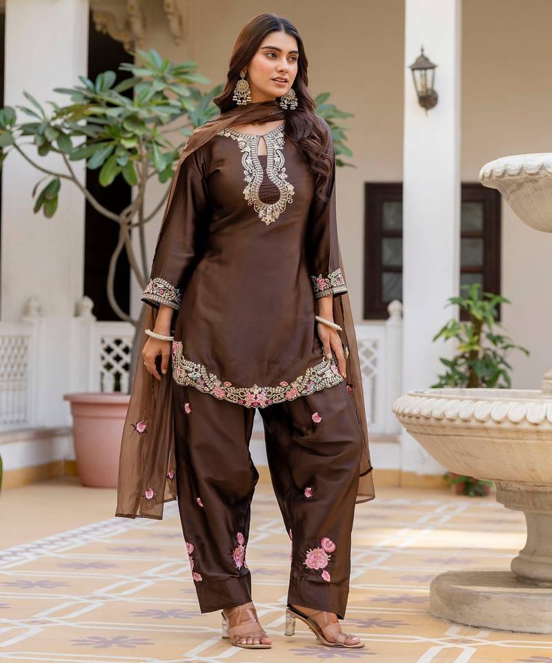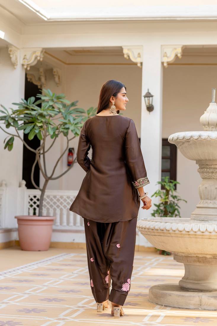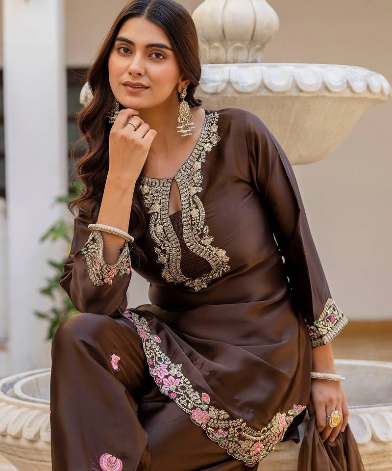| Product Name | Brown Color Japan Satin Fabric Designer Embroidery Work Ethnic Ceremonial Suit | |