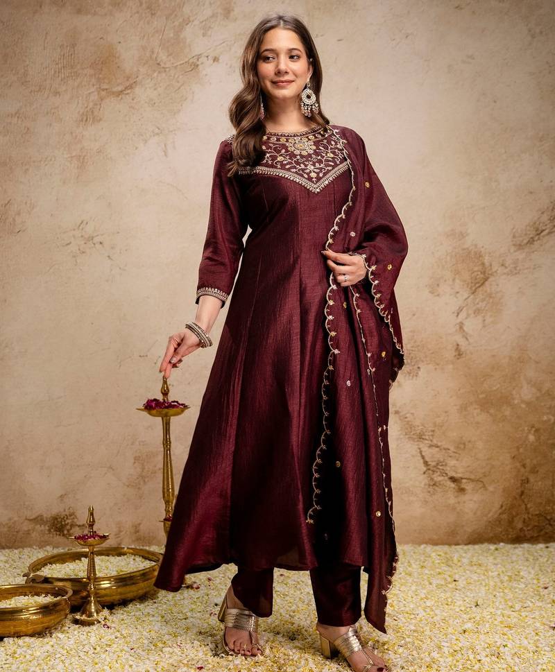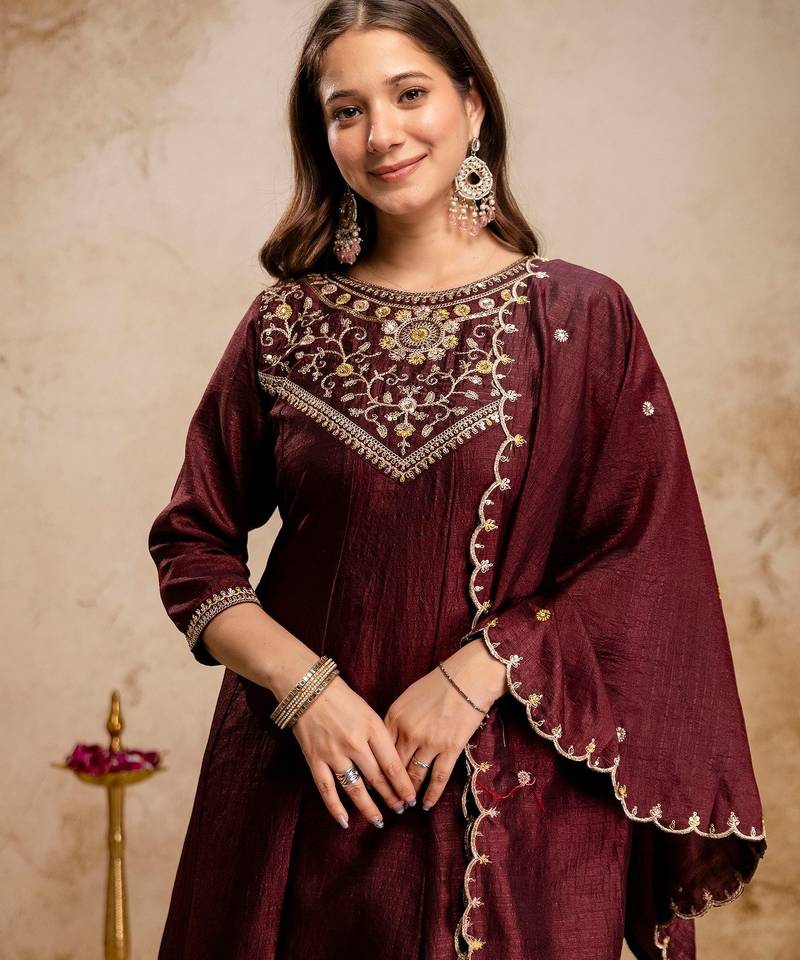 Coffee color vichitra silk fabric beautiful embroidered ceremonial readymade kurta set