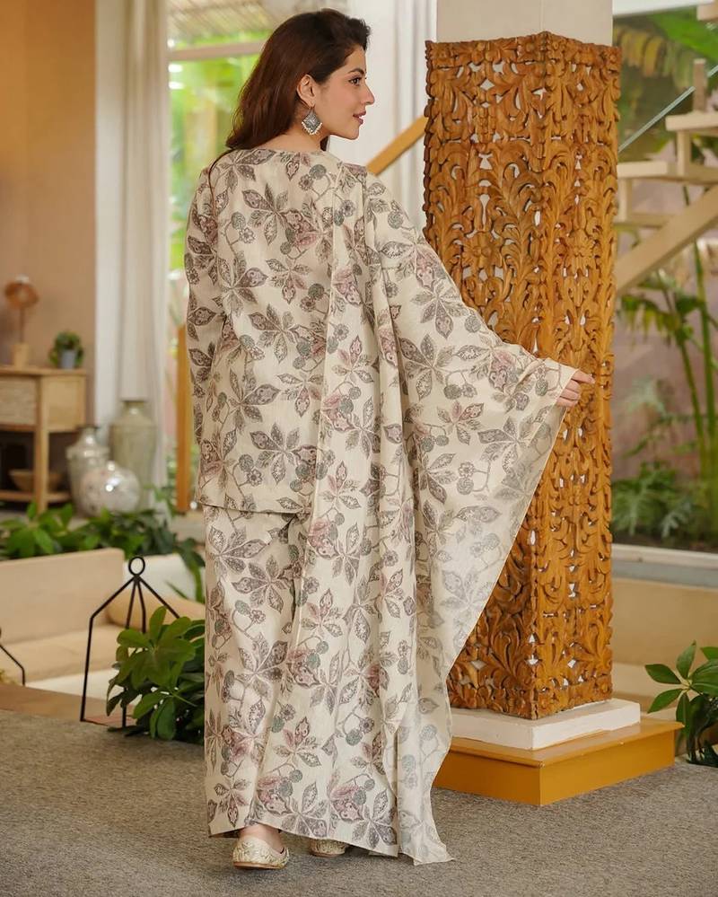 Graceful cream color cotton silk fabric designer printed readymade partywear suit