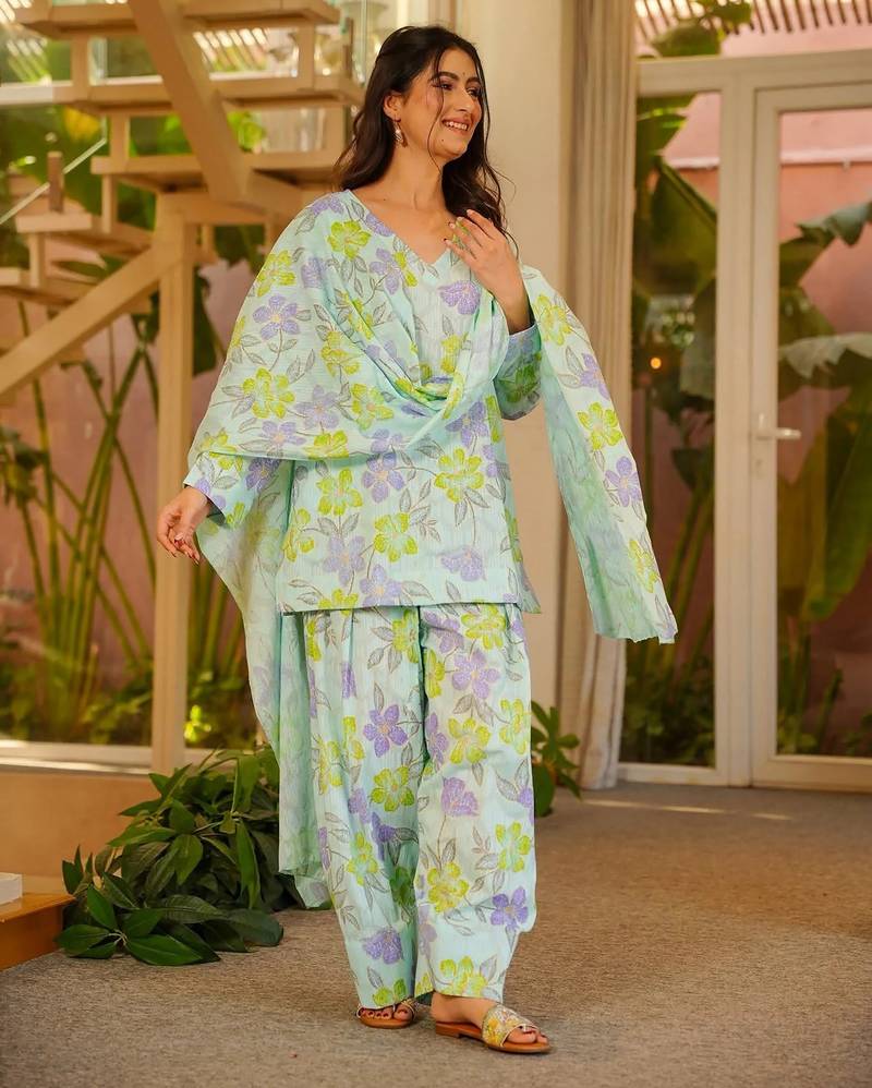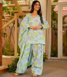 Green color cambric cotton fabric designer digital printed stylish girlie kurta set