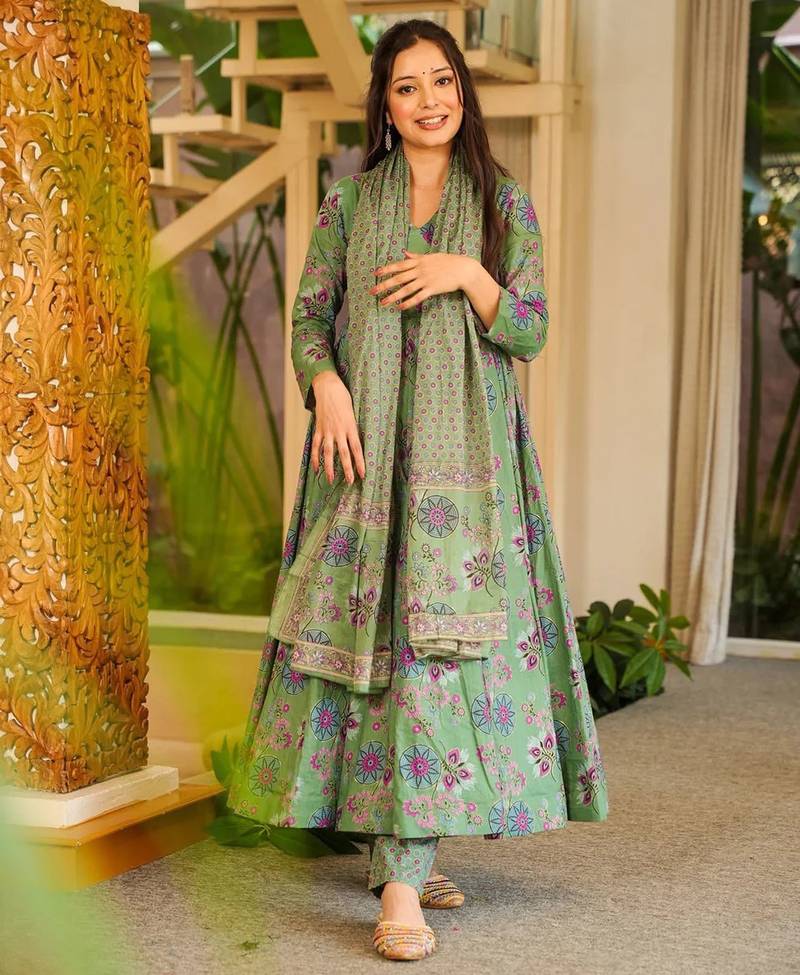 | Product Name | Green Color Cotton Silk Fabric Designer Digital Printed Smart Anarkali Dress | |