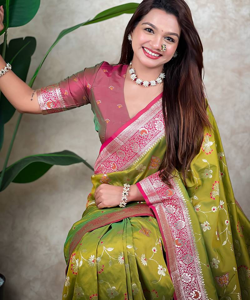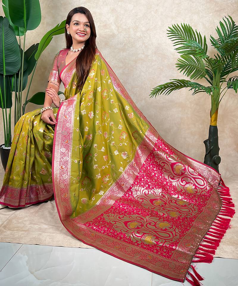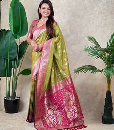 Mahendi color banarasi silk fabric woven jari meenakari jaal designer ethnic partywear saree