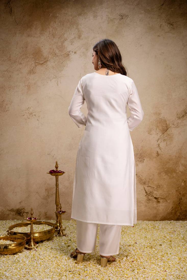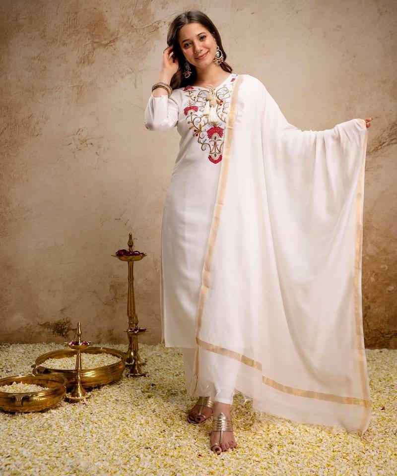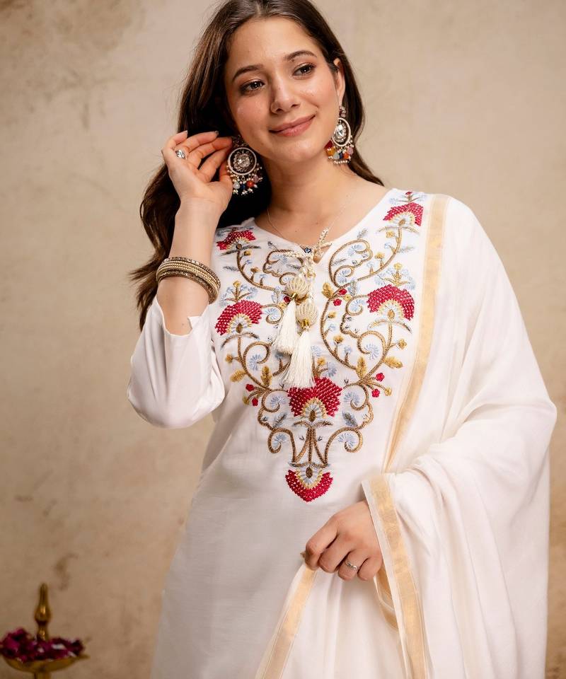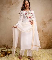 Off white color roman silk fabric designer embroidery work partywear suit
