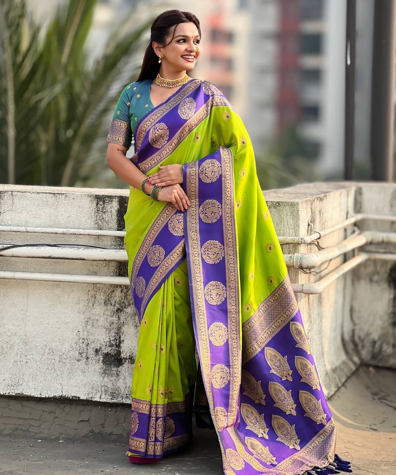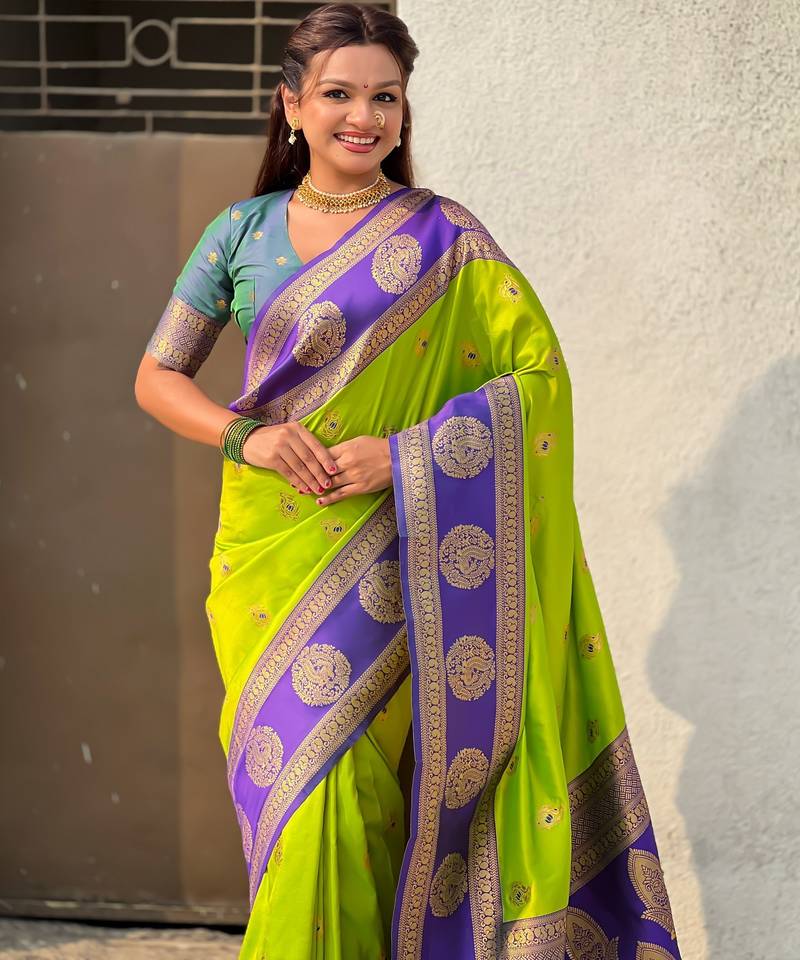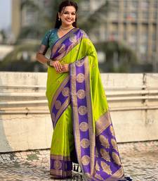 Parrot green color soft silk fabric woven designer girlie rich look saree