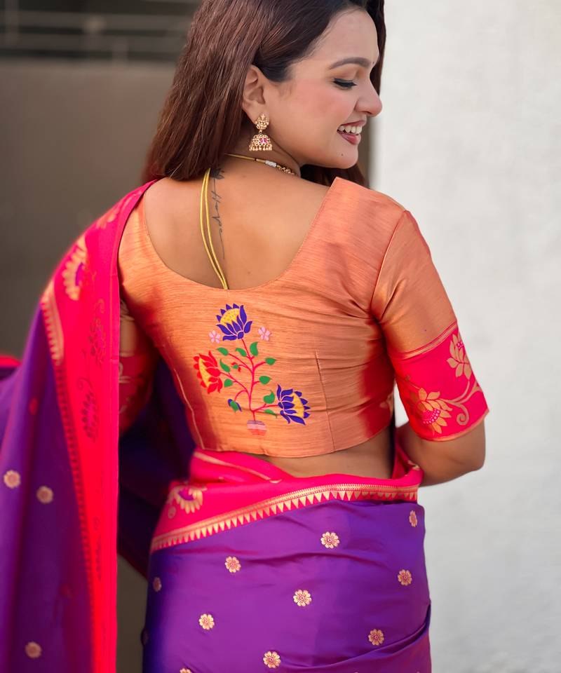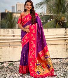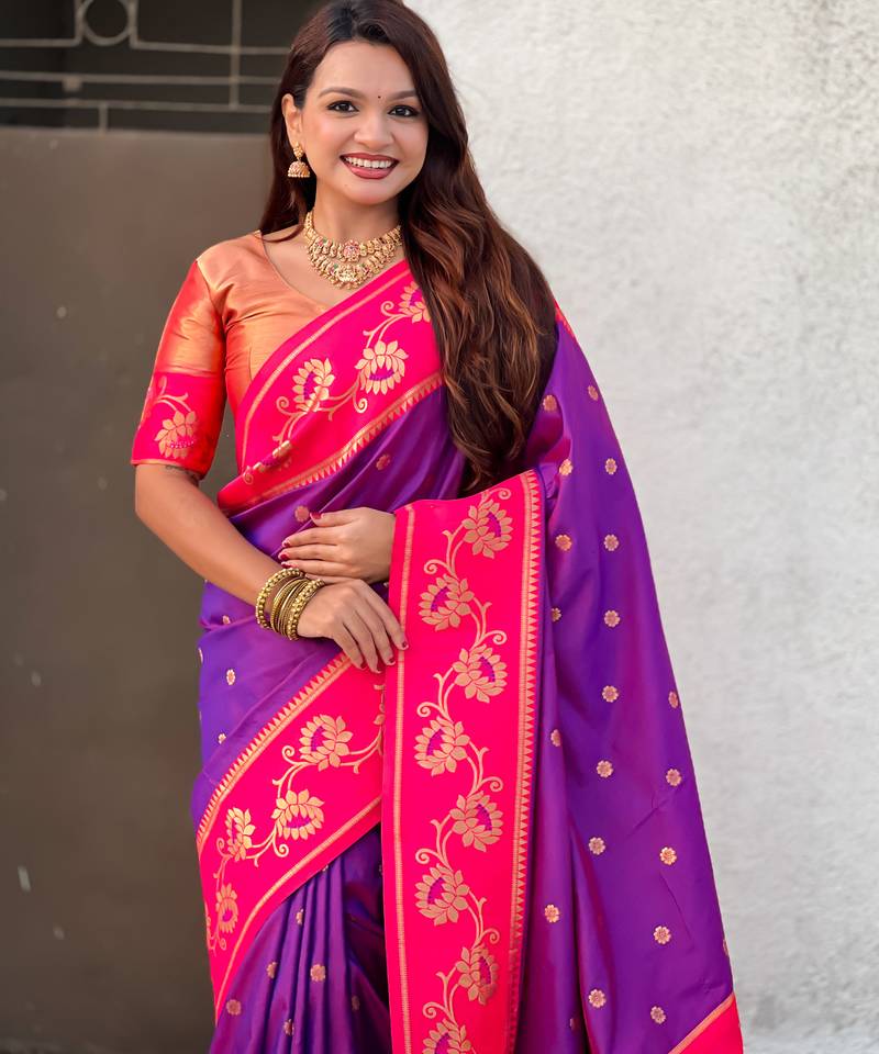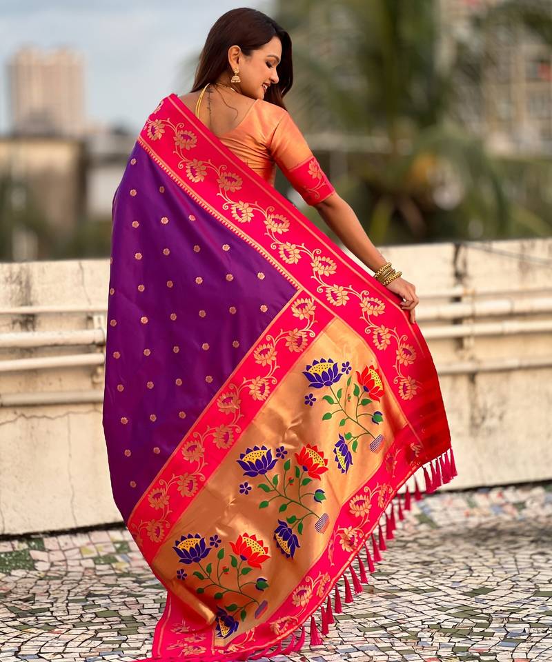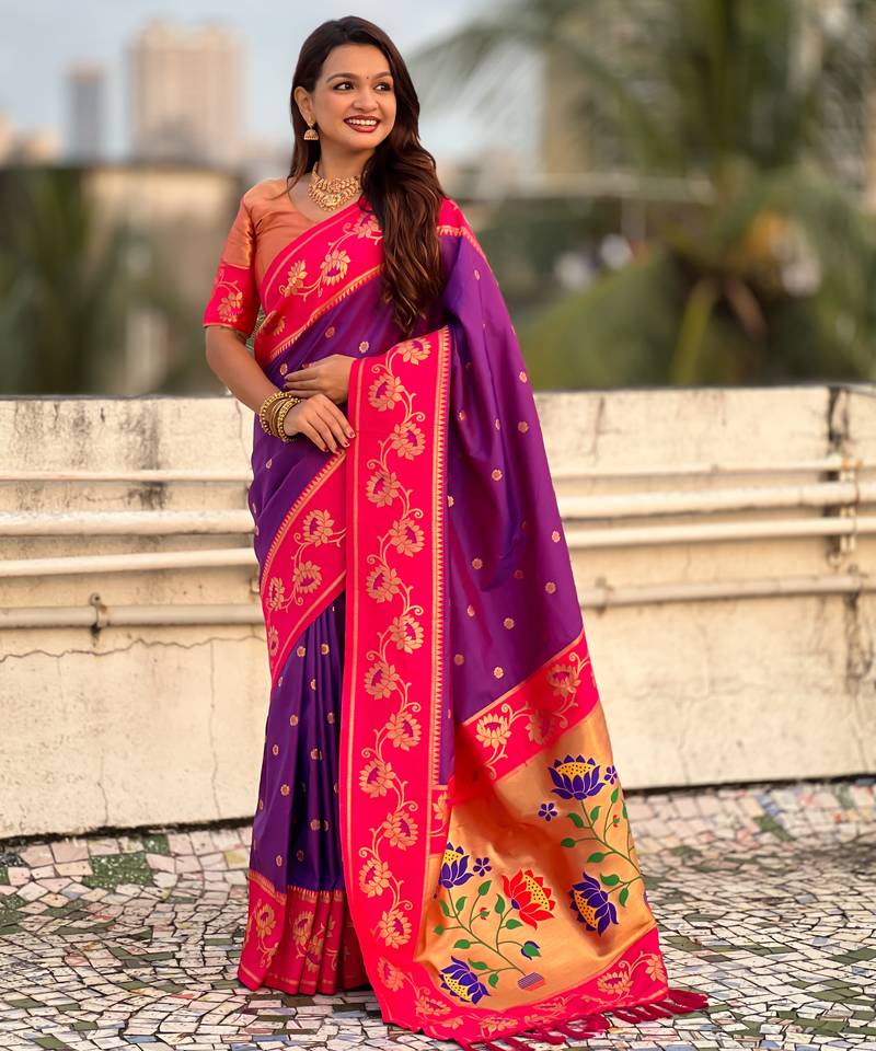 Purple color beautiful woven lotus meenakari designer graceful ethnic saree