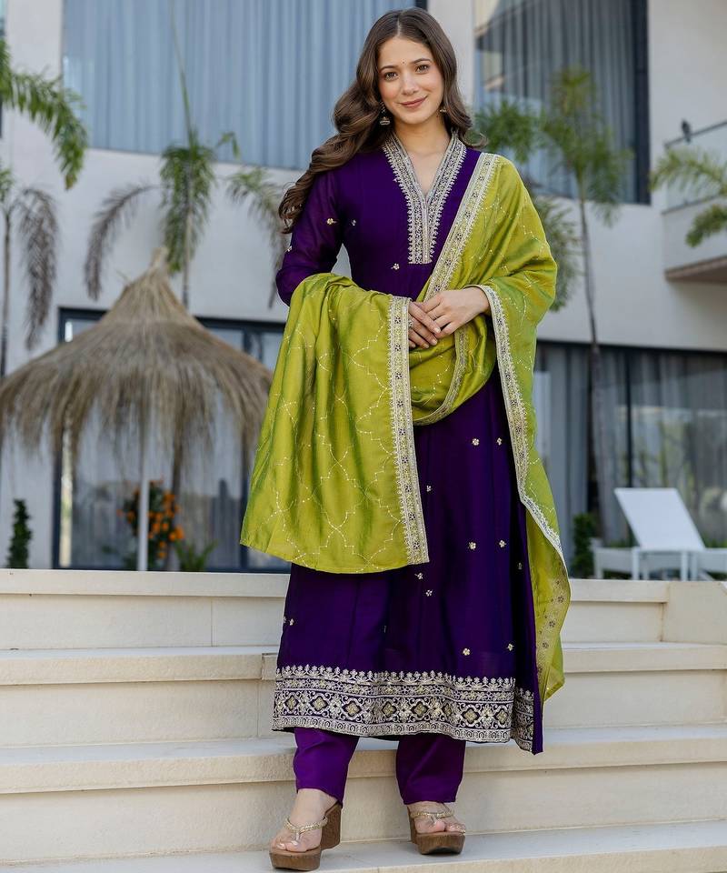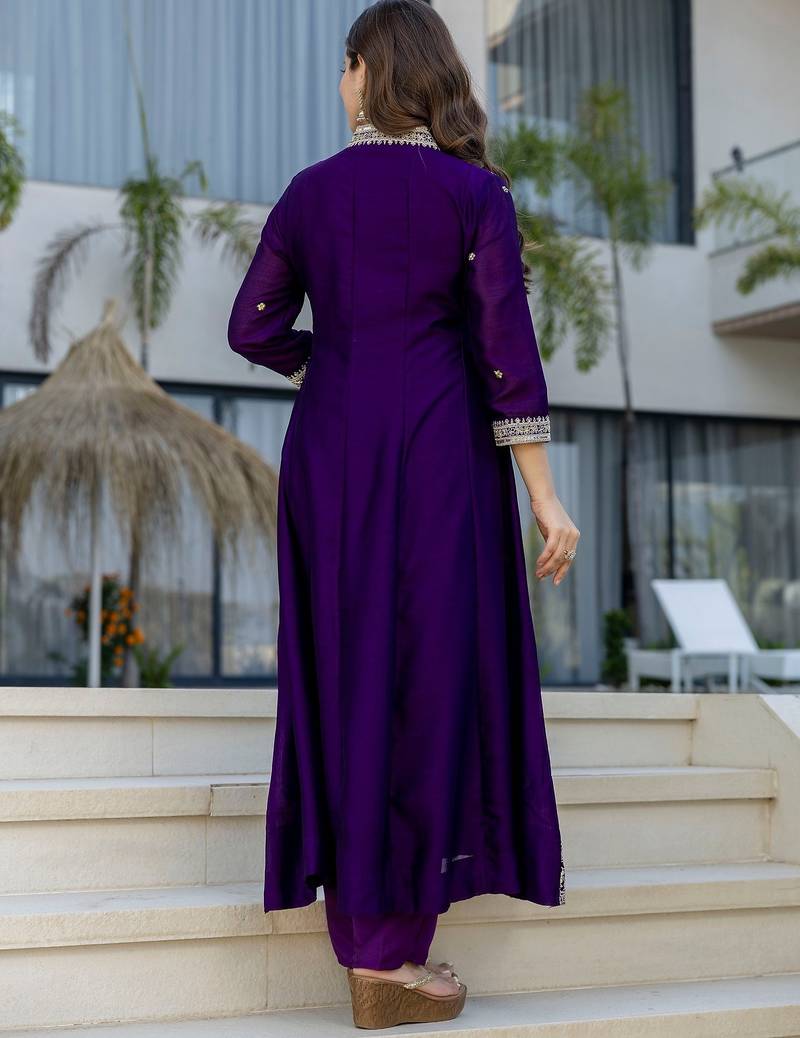 | Product Name | Purple Color Vichitra Silk Fabric Designer Embroidery Work Ethnic Ceremonial Suit | |