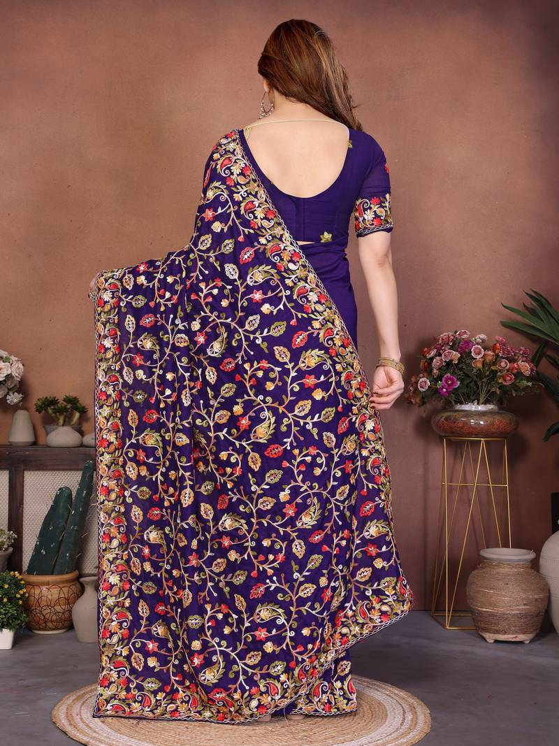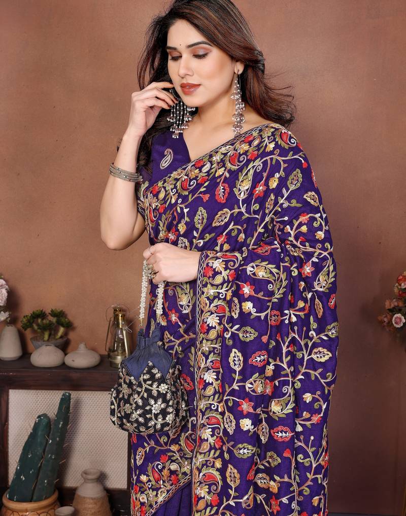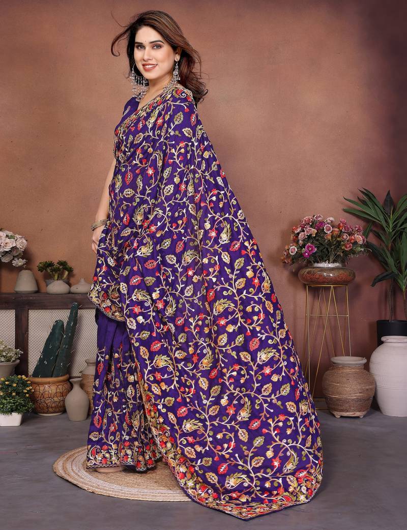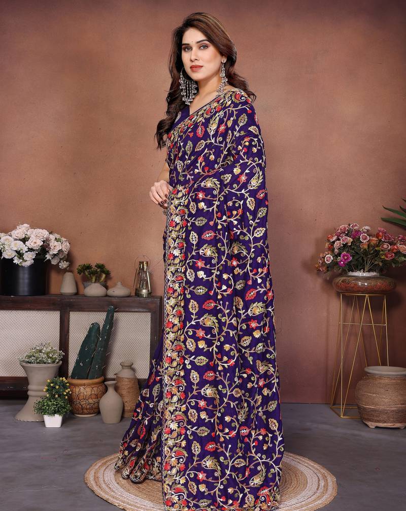 Purple color vichitra silk fabric designer embroidery work graceful partywear saree