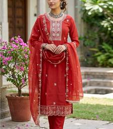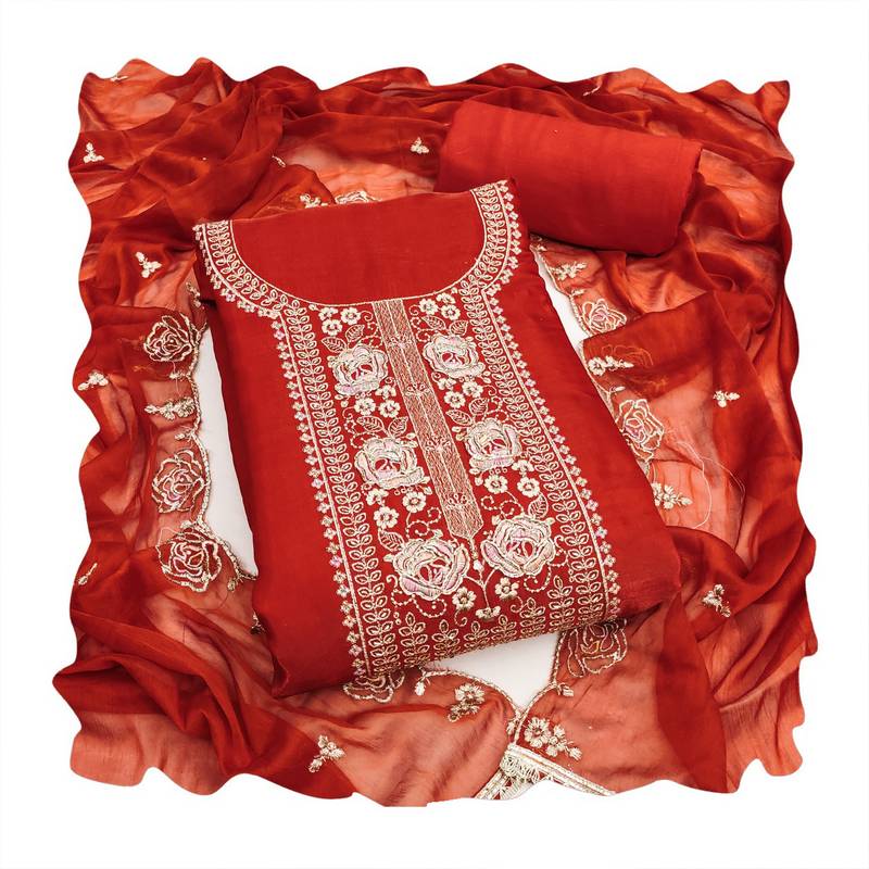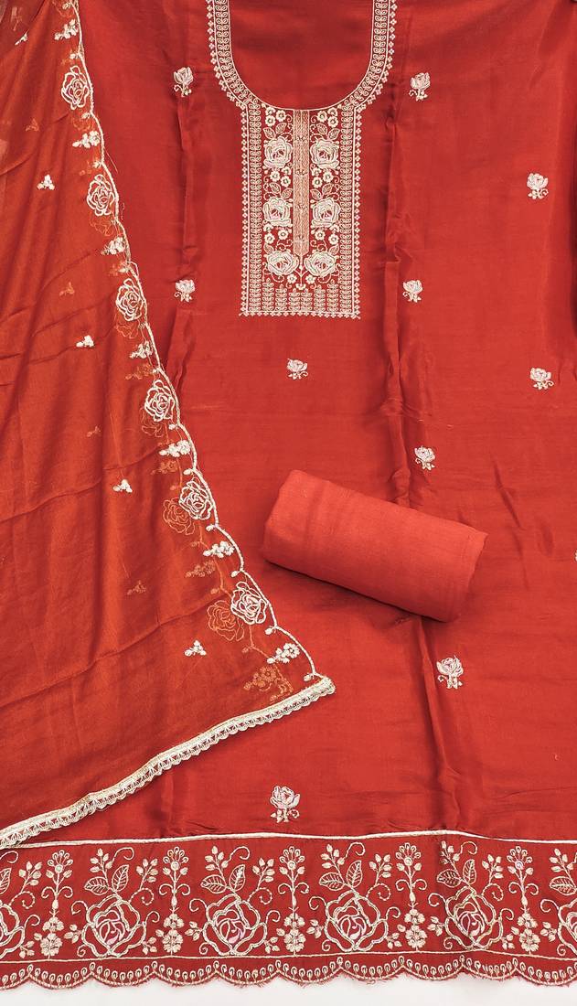 Rust color viscose satin fabric designer ceremonial suit unstitched