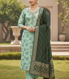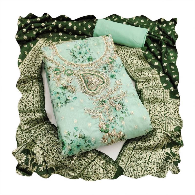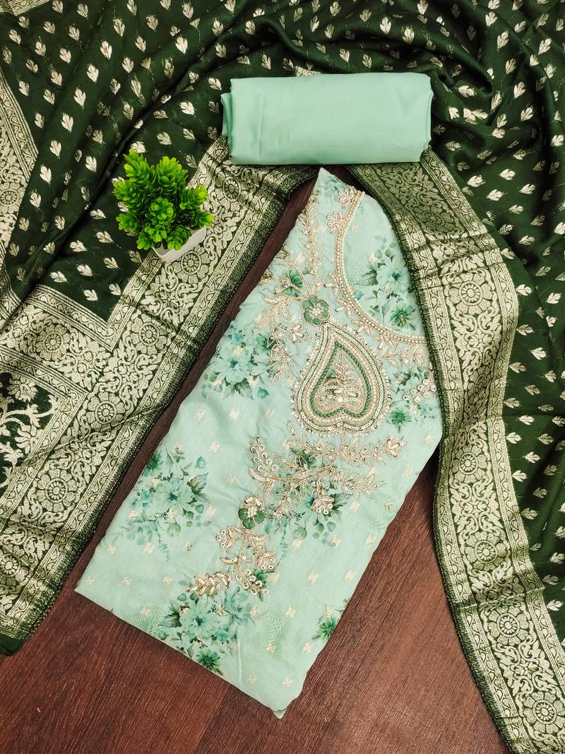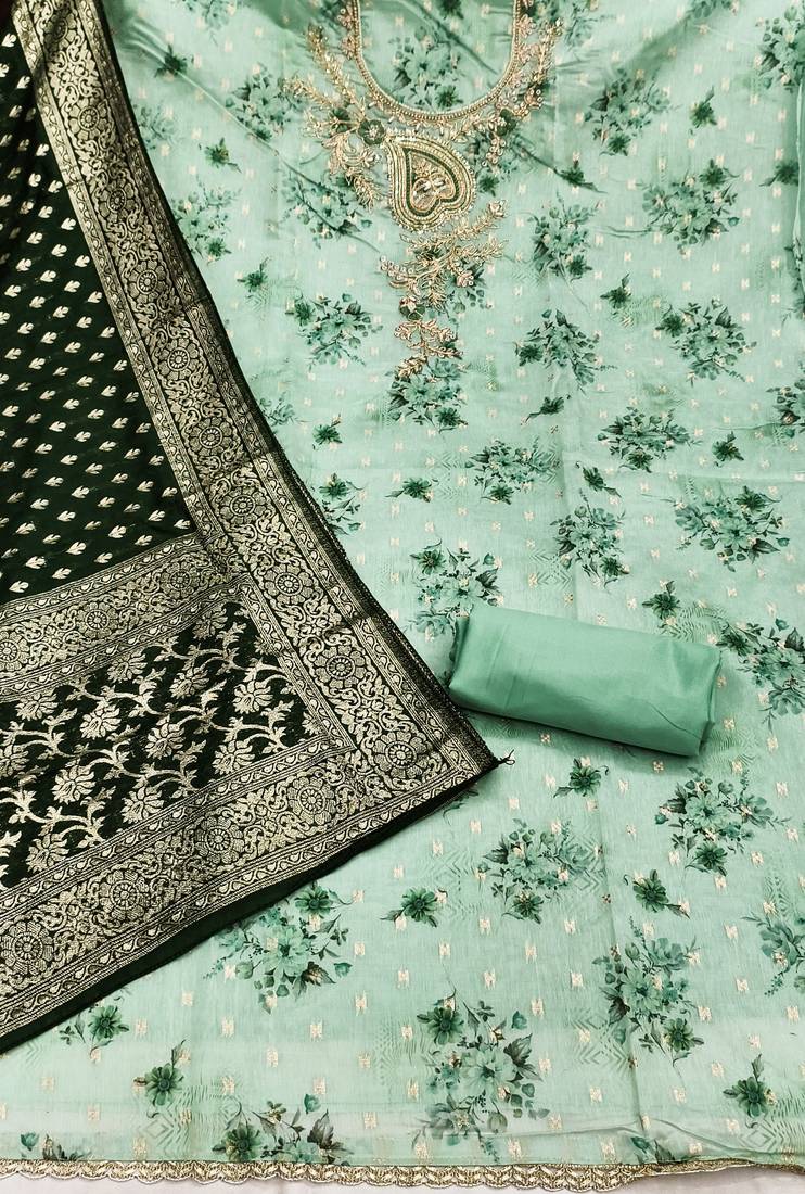 Sea green color beautiful printed with hand work cotton silk fabric salwar kameez unstitched