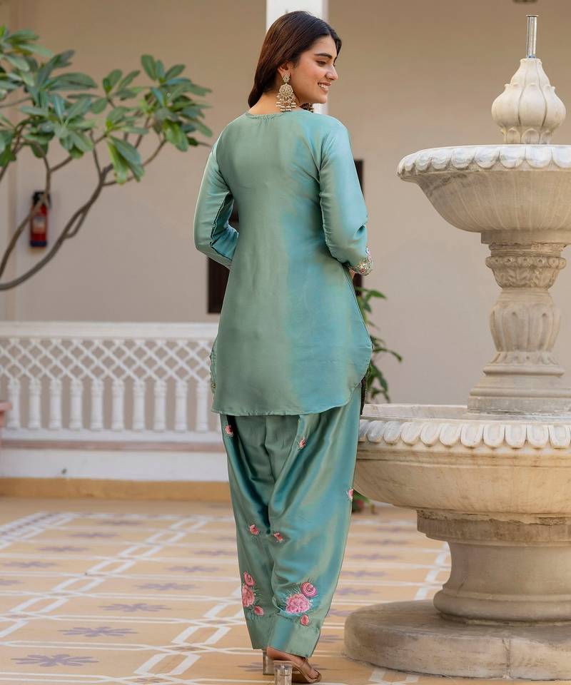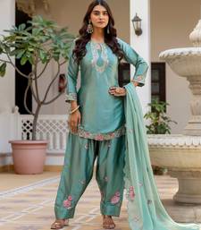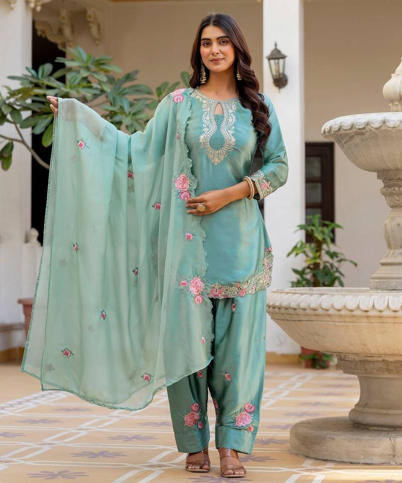 | Product Name | Sea Green Color Japan Satin Fabric Designer Embroidery Work Ethnic Ceremonial Suit | |