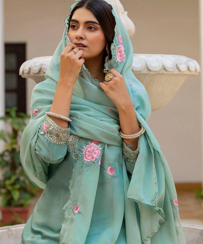 Sea green color japan satin fabric designer embroidery work ethnic ceremonial suit