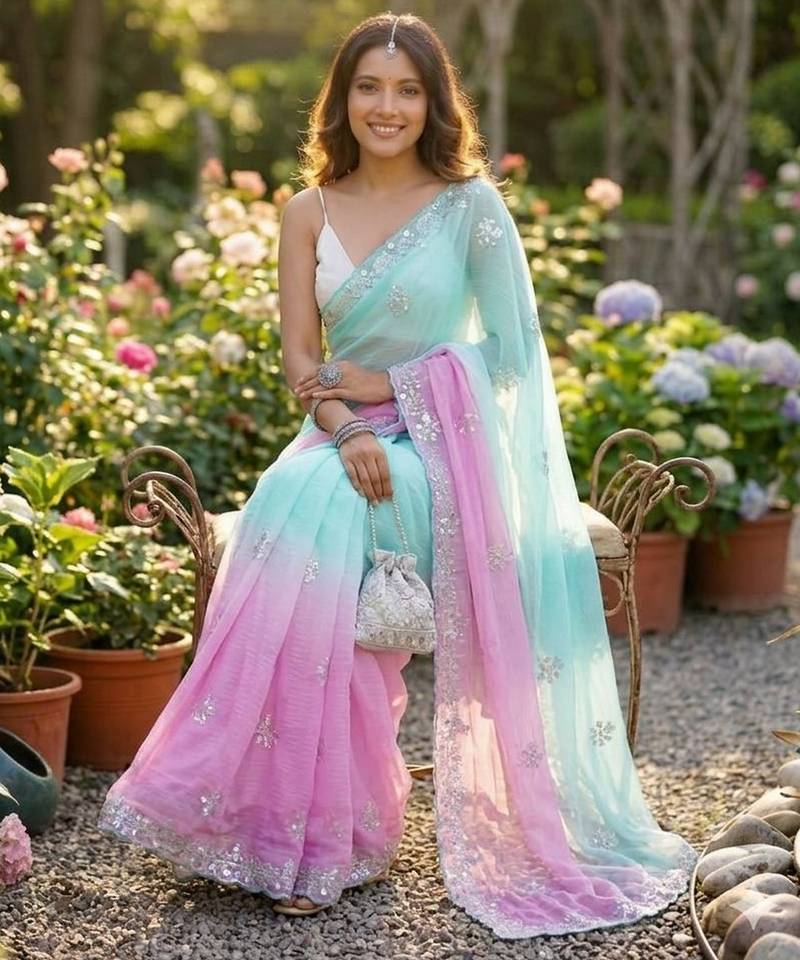 Sea green-pink twin padding color pixel crush fabric smart and sophisticated girlie saree