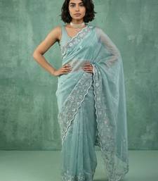 Sky blue color chanda silk fabric thread flower embroidery cut work trendy girlie saree