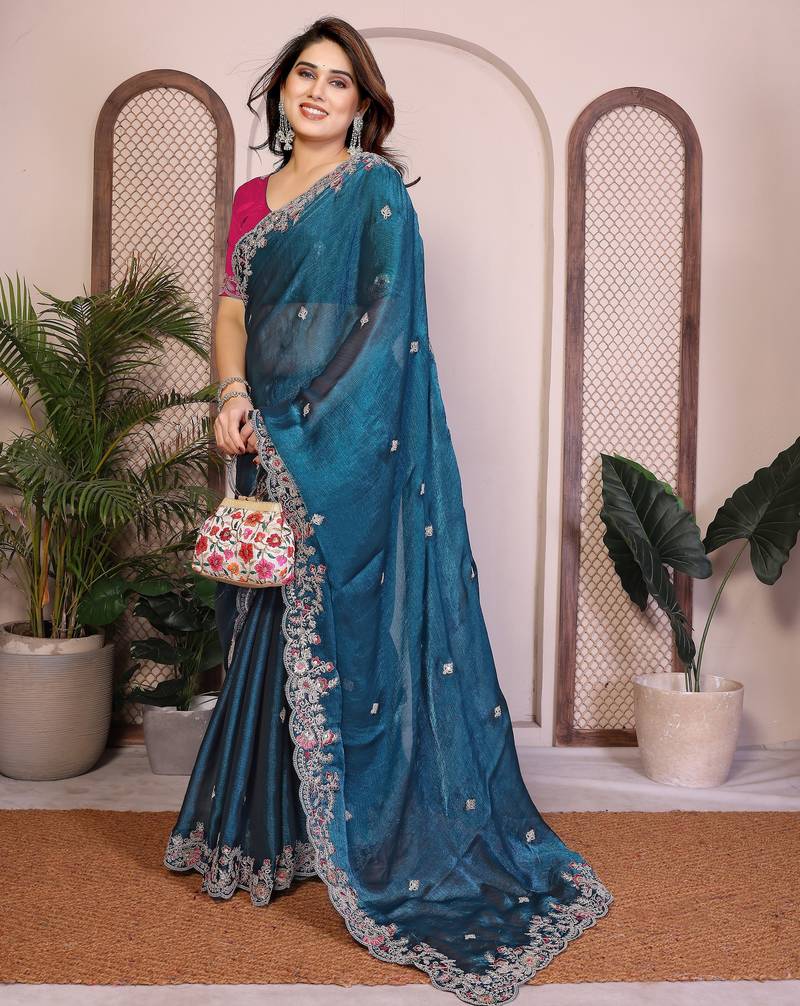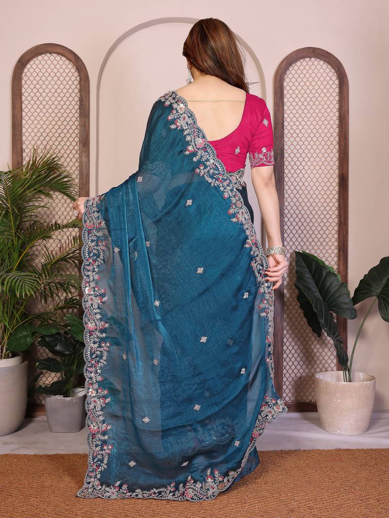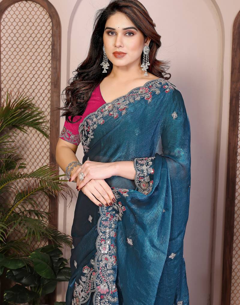 Teal blue color fendy chiffon fabric stylish bollywood style saree