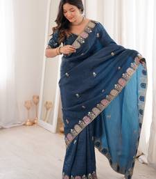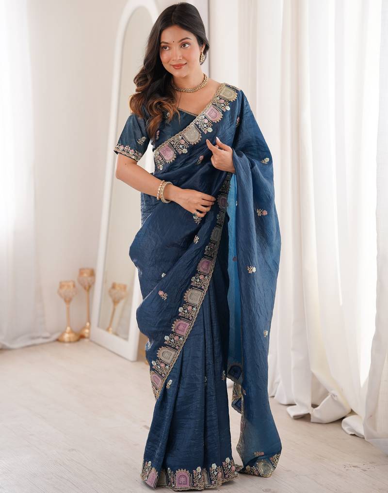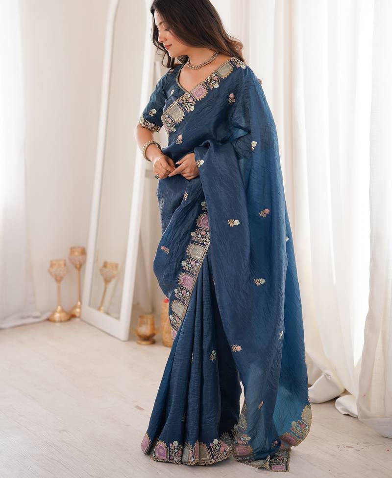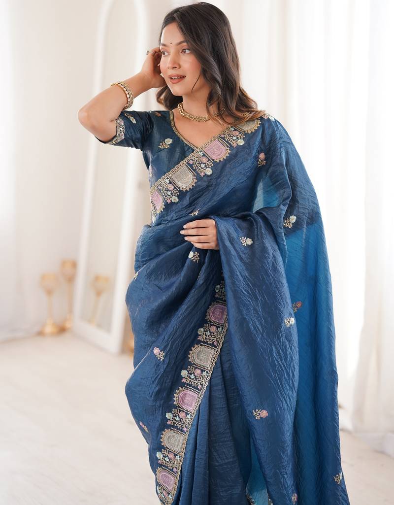 Teal color gold crunchy silk multy thread embroidery work rich fancy saree