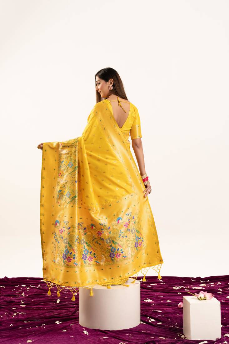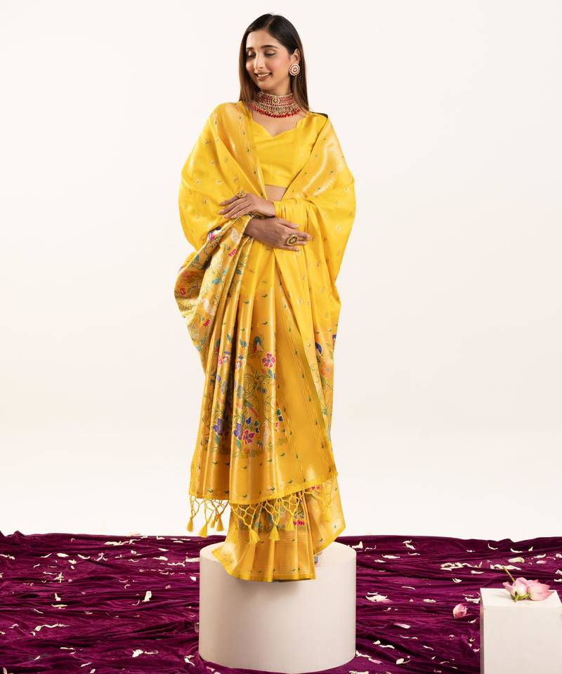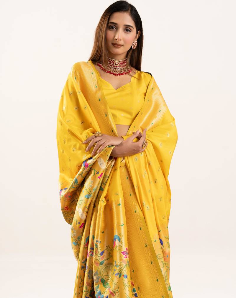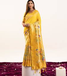 Yellow color banarasi silk fabric heavy partywear ceremonial saree