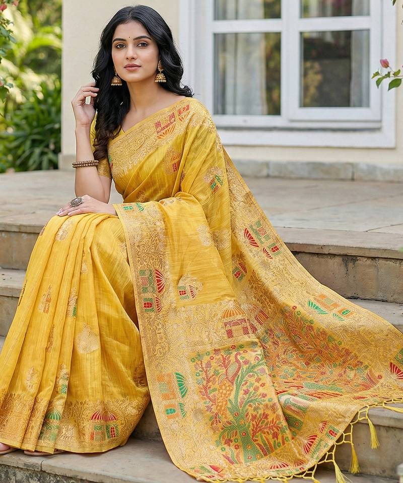 | Product Name | Yellow Color Linen Cotton Fabric Woven Designer Ethnic Partywear Saree | |