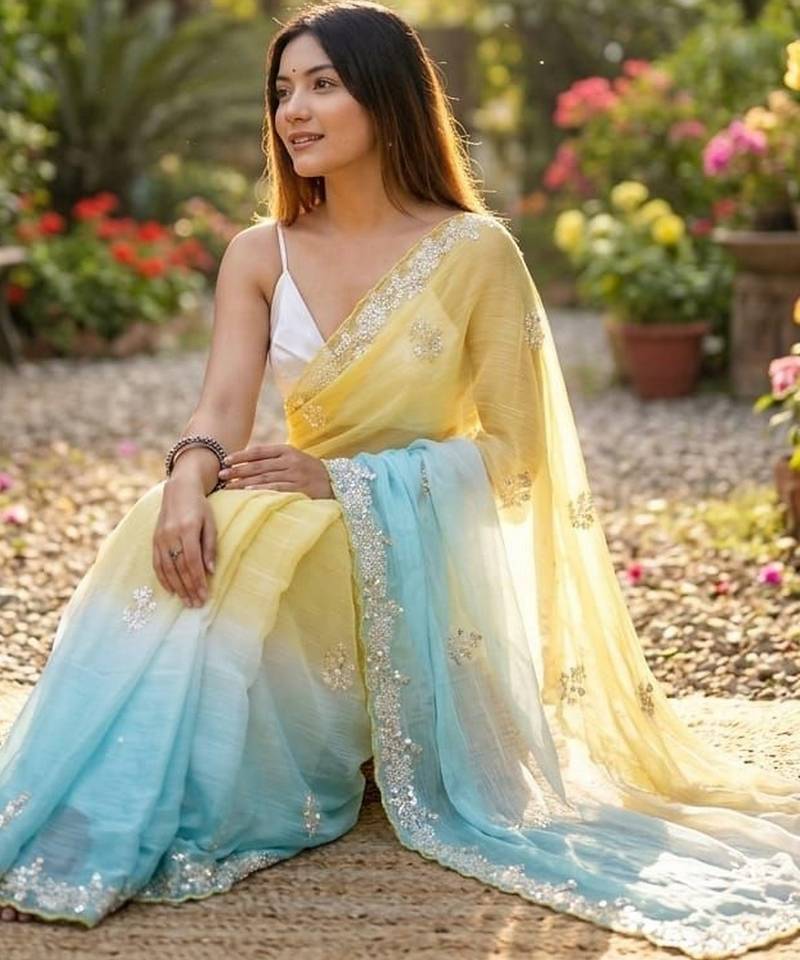 | Product Name | Yellow Sky Blue Twin Padding Color Pixel Crush Fabric Smart And Sophisticated Girlie Saree | |