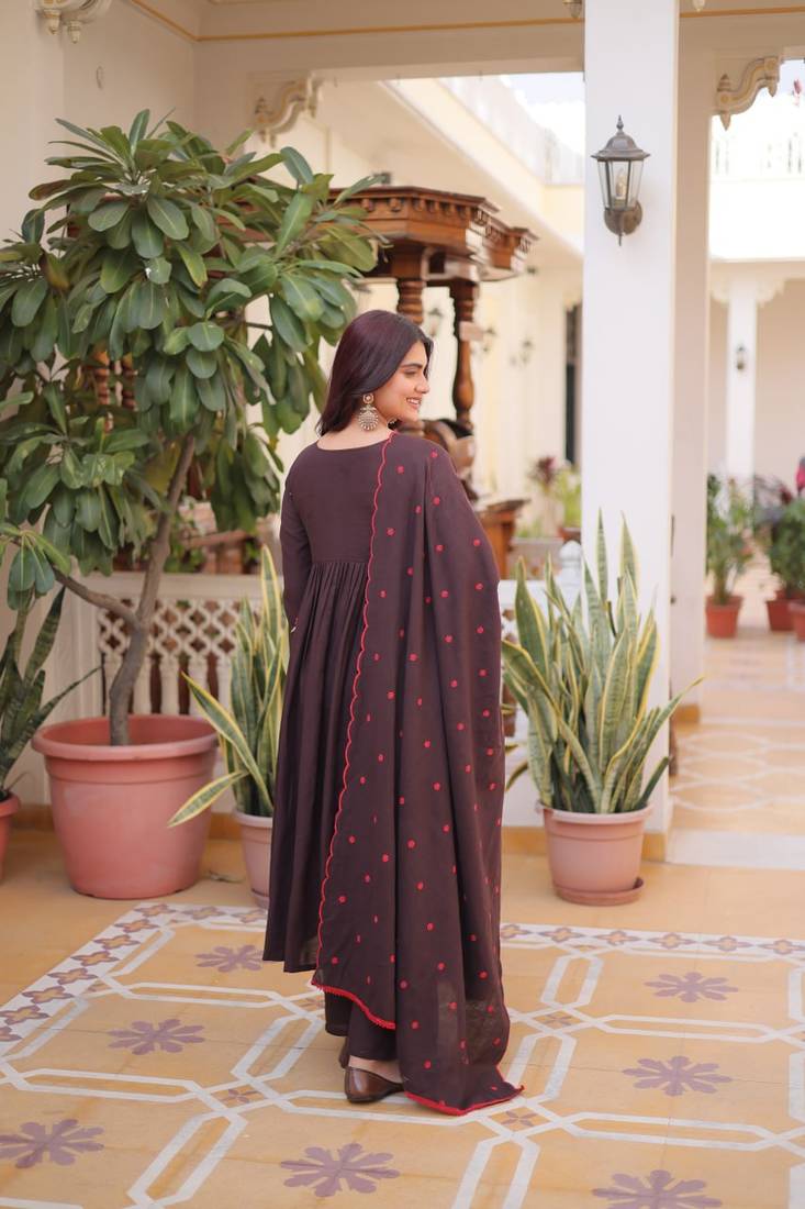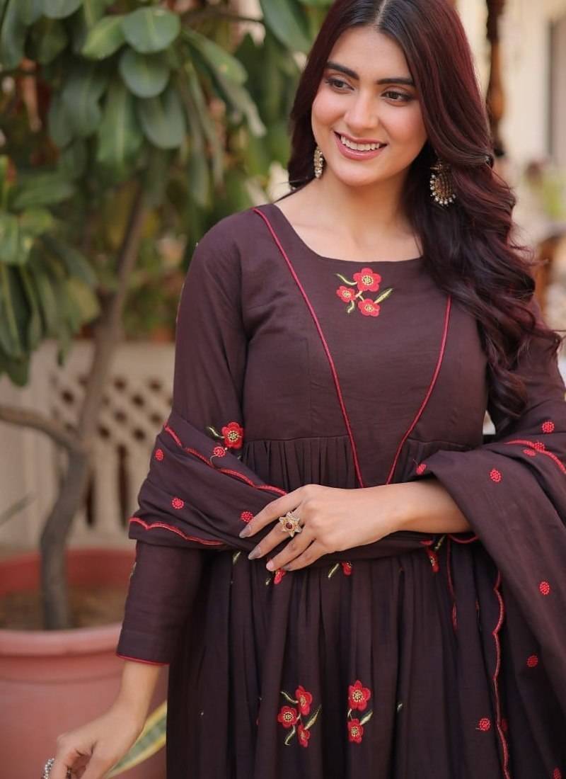 | Product Name | Brown Cotton With Embroidered Work Stitched Kurti Pant & Dupatta Set | |
