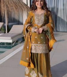 Mehendi zari & sequins embroidered work stitched top sharara with dupatta set for women