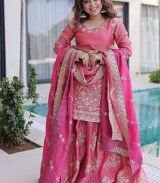 Peach zari & sequins embroidered work stitched kurta sharara with dupatta set for women