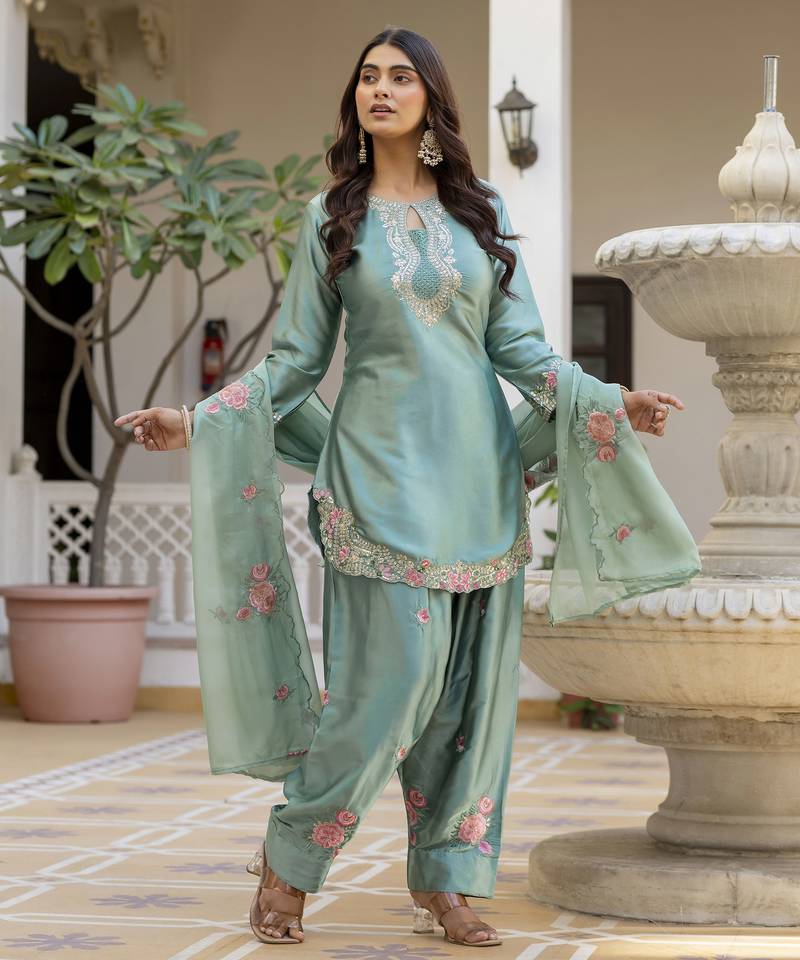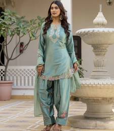 Turquoise blue embroidered japan satin stitched kurti set with dupatta & patiyala pant