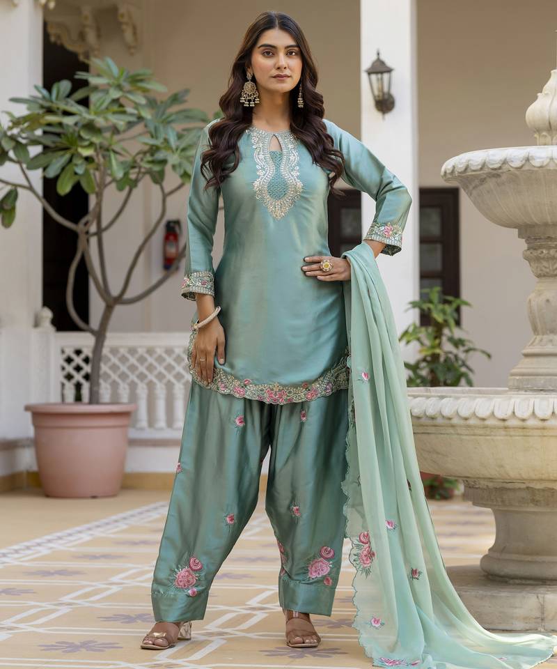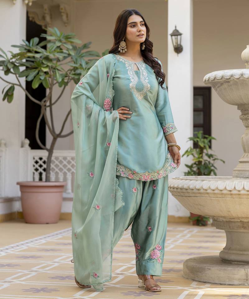 | Product Name | Turquoise Blue Embroidered Japan Satin Stitched Kurti Set With Dupatta & Patiyala Pant | |
