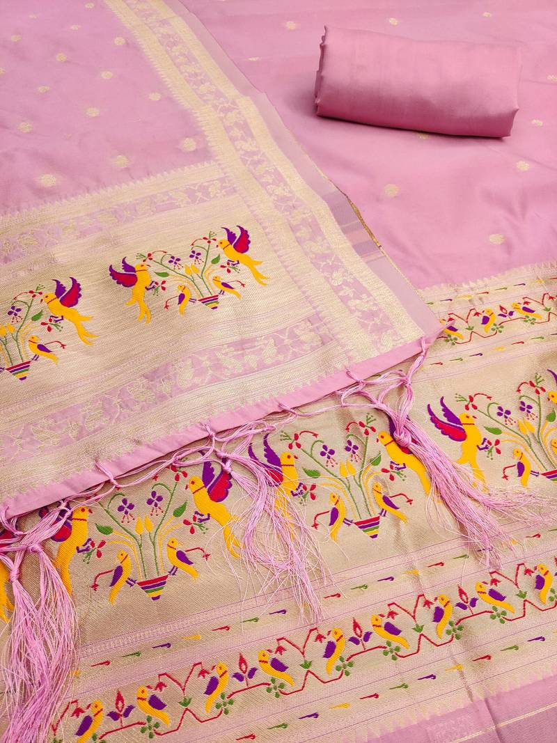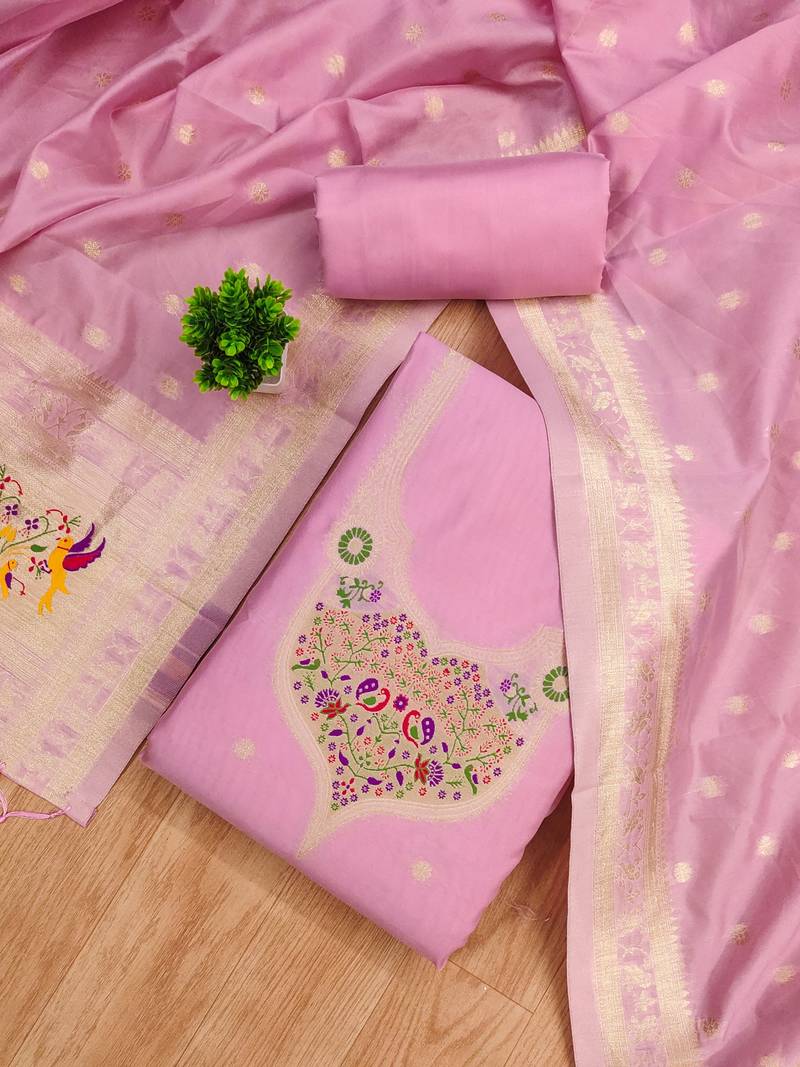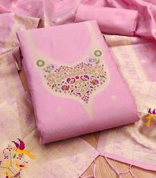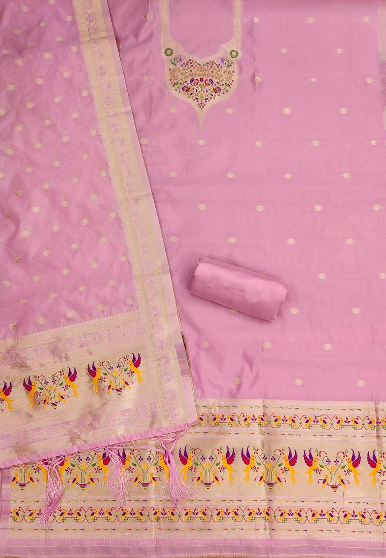 Baby pink soft banarasi silk pure zari woven design dress material unstitched