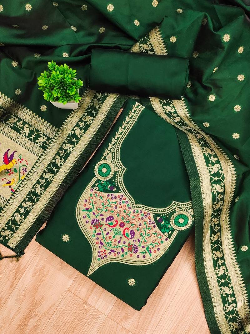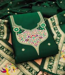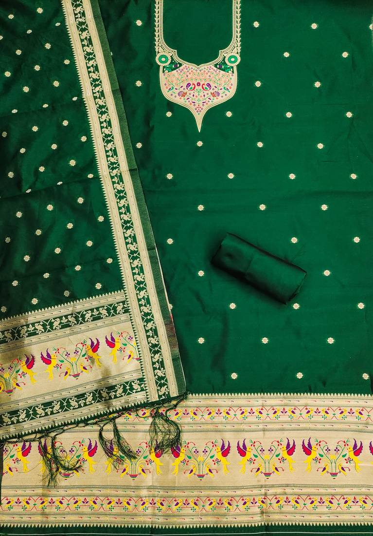 Bottle green soft banarasi silk pure zari woven design dress material unstitched