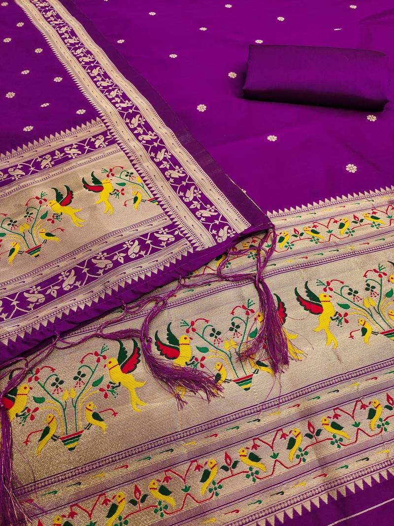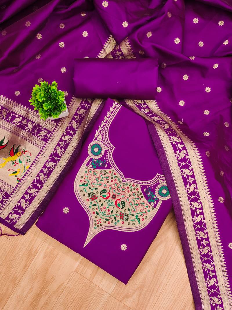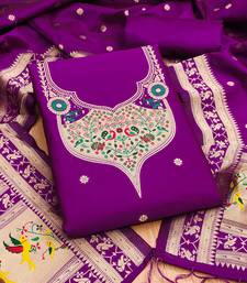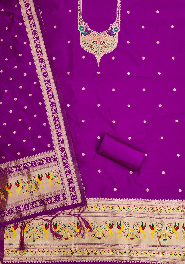 Purple soft banarasi silk pure zari woven design dress material unstitched