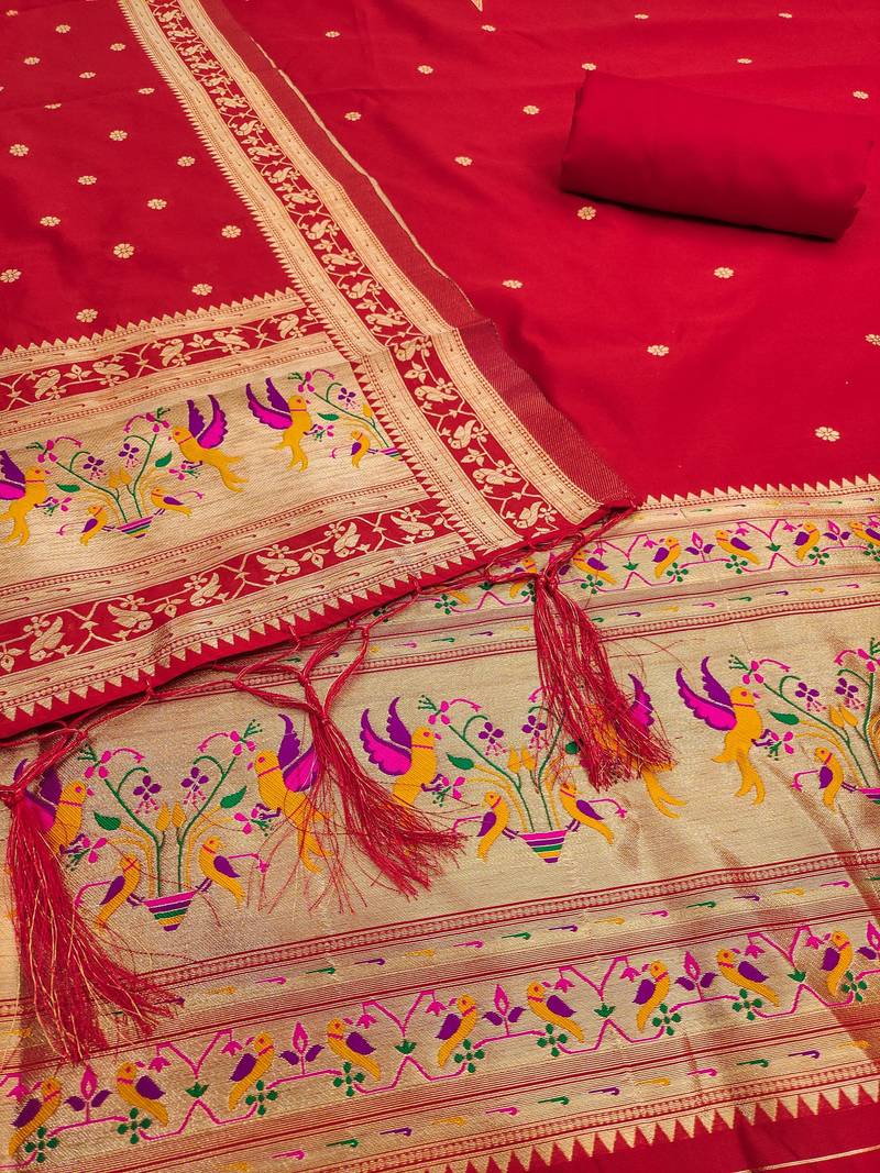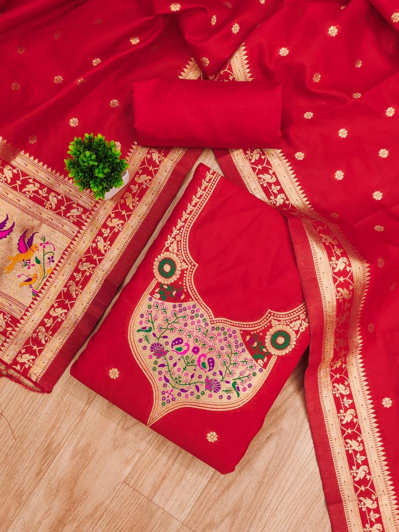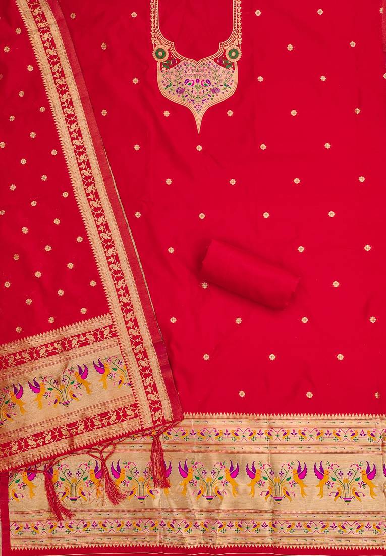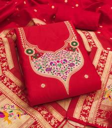 Red soft banarasi silk pure zari woven design dress material unstitched