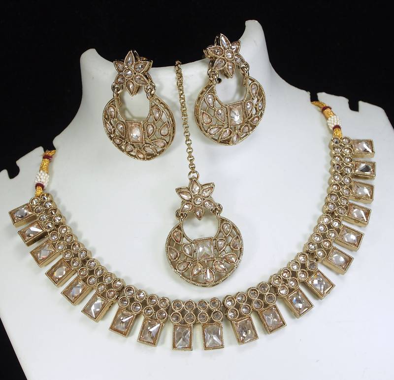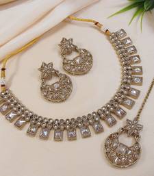 | Product Name | Beautiful Champaigne Gold Antique Gold Plated Ad/Zircon Work Polki Necklace Jewelry Set With Maangtika | |