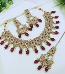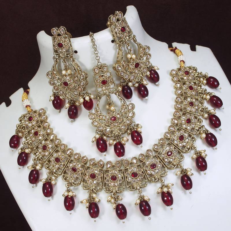 | Product Name | Beautiful Maroon Antique Gold Plated Ad/Zircon Work Polki Necklace Jewelry Set With Maangtika | |