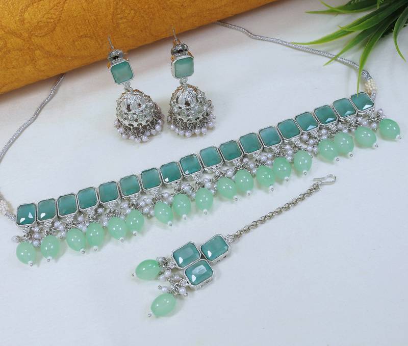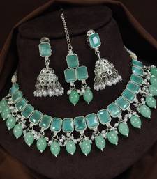 Beautiful mint green rhodium plated ad::Zircon work polki necklace jewelry set with maangtika